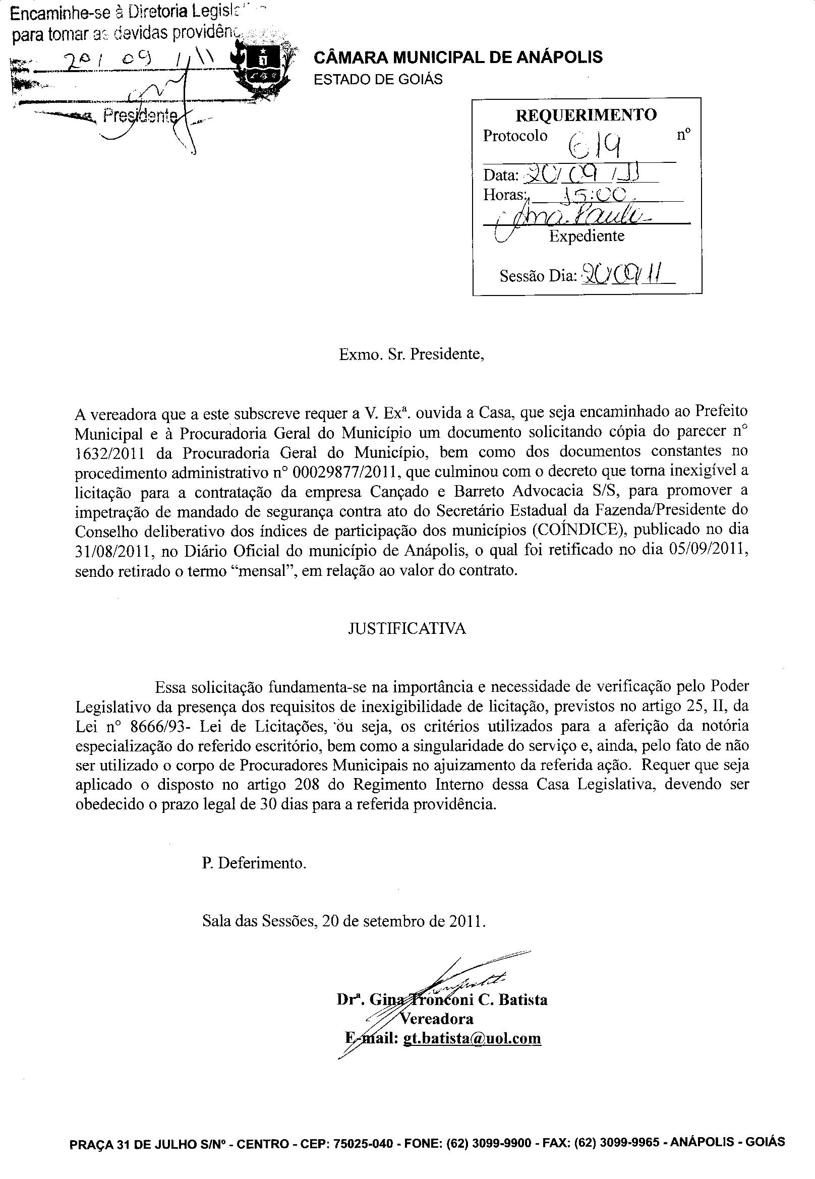 Ementa: A VEREADORA QUE A ESTE SUBSCREVE REQUER A V.EXª. OUVIDA A CASA, QUE SEJA ENCAMINHADO AO PREFEITO MUNICIPAL E A PROCURADORIA GERAL DO MUNICÍPIO UM DOCUMENTO SOLICITANDO CÓPIA DO PARECER N° 1632/2011 DA PROCURADORIA GERAL DO MUNICÍPIO, BEM COMO DOS DOCUMENTO CONSTANTES NO PROCEDIMENTO ADMINISTRATIVO N° 00029877/2011, QUE CULMINOUU COM O DECRETO QUE TORNA INEXIGIVEL A LICITAÇÃO PARA A CONTRATAÇÃO DA EMPRESA CANÇADO E BARRETO ADVOCACIA S/S, PARA PROMOVER A IMPETRAÇÃO DE MANDADO DE SEGURANÇA CONTRA ATO DO SECRETARIO ESTADUAL DA FAZENDA/PRESIDENTE DO CONSELHO DELIBERATIVO DOS INDICES DE PARTICIPAÇÃO DOS MUNICÍPIOS DE ANÁPOLIS, O QUAL FOI RETIFICADO NO DIA 05/09/2011 SENDO RETIRADO O TERMO "MENSAL", EM RELAÇÃO AO VALOR DO CONTRATO.
