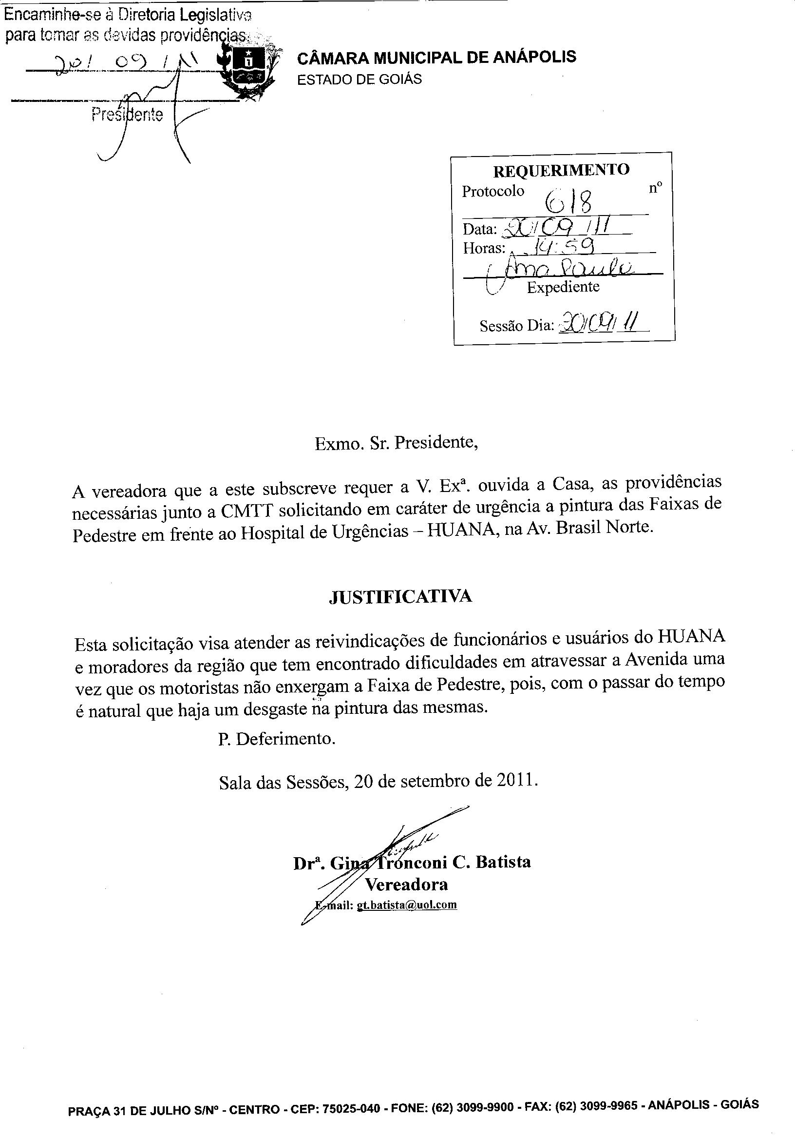 Ementa: A VEREADORA QUE A ESTE SUBSCREVE REQUER A V.EXª. OUVIDA A CASA, AS PROVIDÊNCIAS NECESSÁRIAS JUNTO A CMTT SOLICITANDO EM CARÁTER DE URGÊNCIA A PINTURA DAS FAIXAS DE PEDESTRE EM FRENTE AO HOSPITAL DE URGÊNCIA - HUANA, NA AVENIDA BRASIL NORTE.
