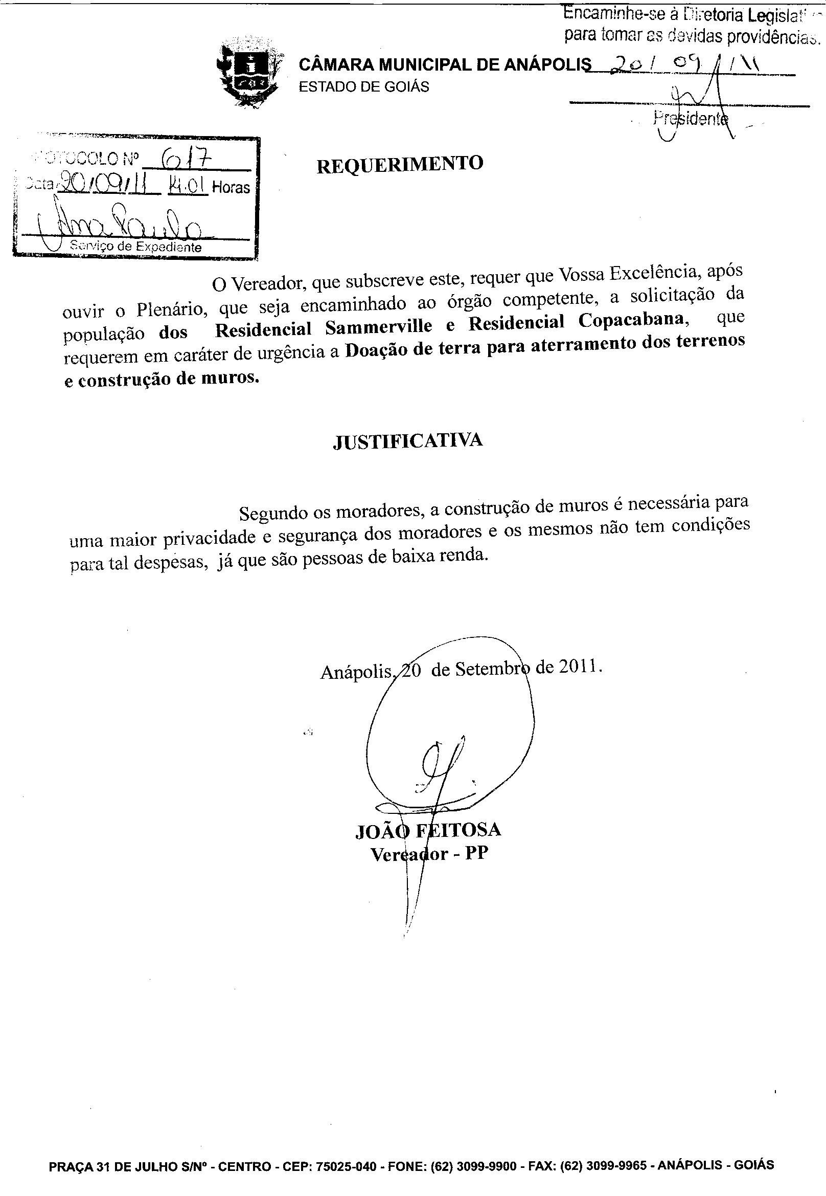 Ementa: O VEREADOR, QUE ESTE SUBSCREVE, REQUER QUE VOSSA EXCELÊNCIA, APÓS OUVIR O PLENÁRIO, QUE SEJA ENCAMINHADO AO ÓRGÃO COMPETENTE, A SOLICITAÇÃO DA POPULAÇÃO DOS RESIDENCIAL SAMMERVILLE E RESIDENCIAL COPACABANA, QUE REQUEREM EM CARATER DE URGÊNCIA A DOAÇÃO DE TERRA PARA ATERRAMENTO DOS TERRENOS E CONSTRUÇÕES DE MUROS.