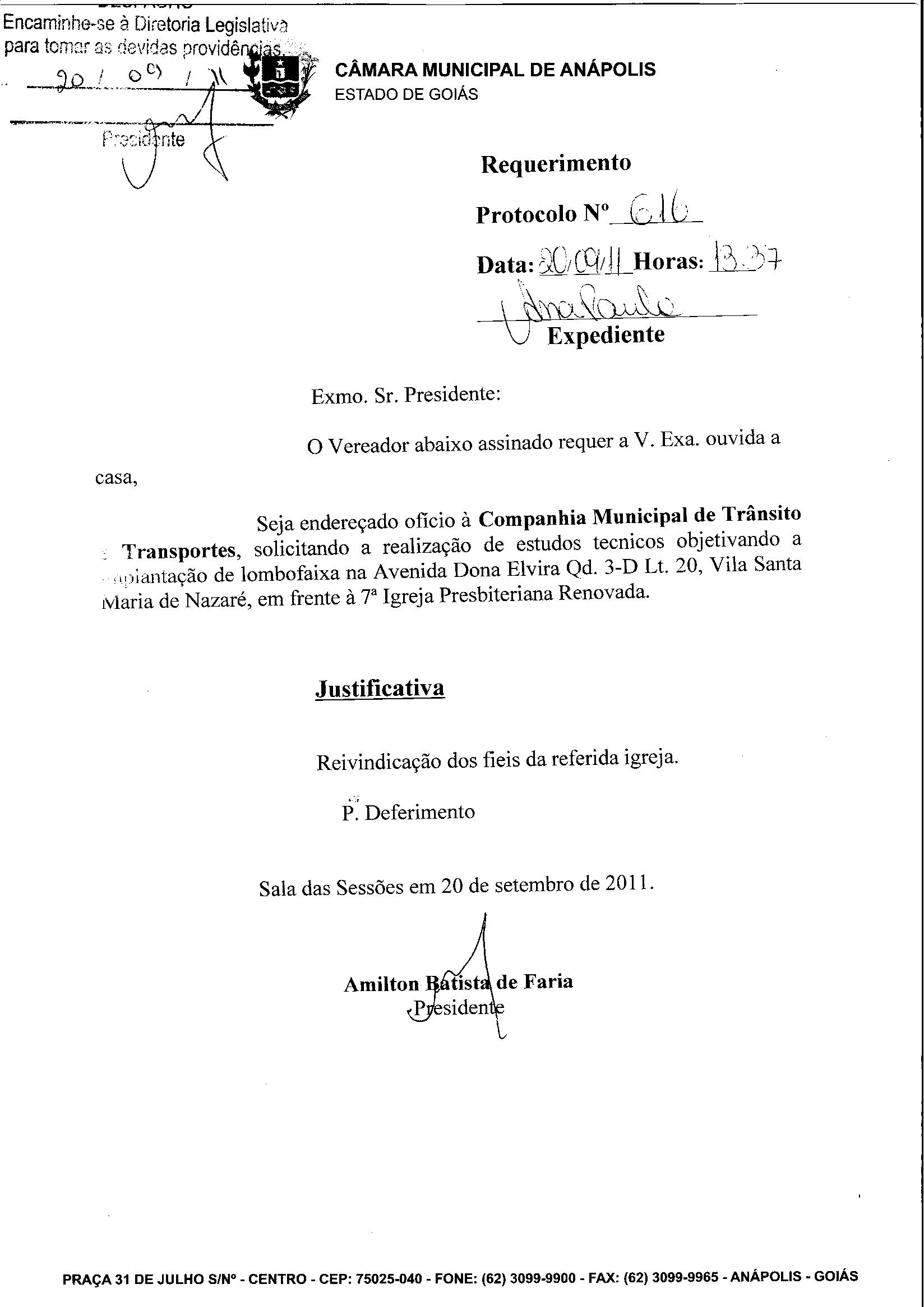 Ementa: O VEREADOR ABAIXO ASSINADO REQUER A V.EXA. OUVIDA A CASA, SEJA ENDEREÇADO OFÍCIO À COMPANHIA MUNICIPAL DE TRÂNSITO E TRANSPORTE, SOLITANDO A REALIZAÇÃO DE ESTUDOS TECNICOS OBJETIVANDO A IMPLANTAÇÃO DE LOMBOFAIXA NA AVENIDA DONA ELVIRA QD. 3-D LT. 20, VILA SANTA MARIA DE NAZARÉ, EM FRENTE À 7ª IGREJA PRESBITERIANA RENOVANA.