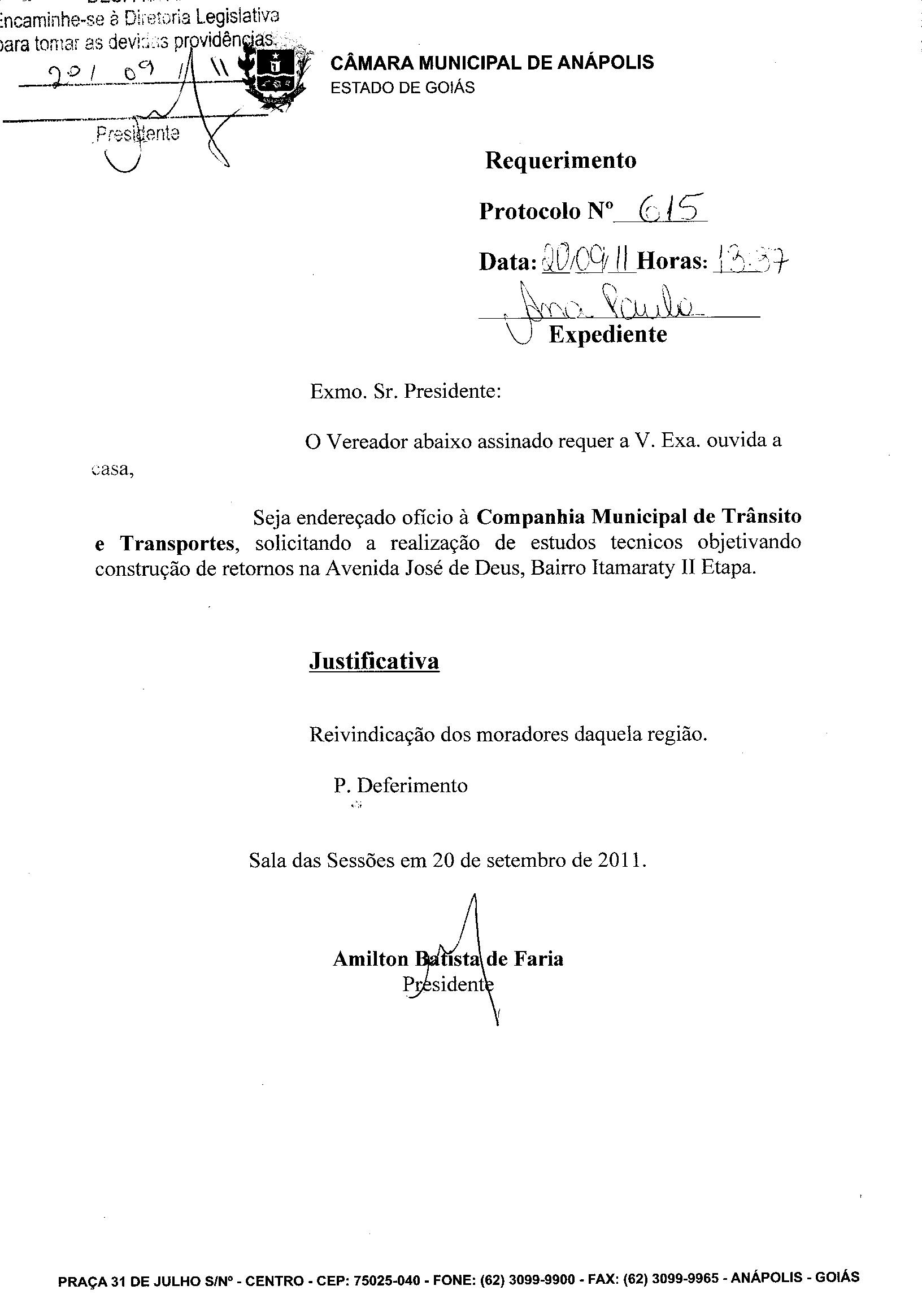 Ementa: O VEREADOR ABAIXO ASSINADO REQUER A V.EXA OUVIDA A CASA, SEJA ENDEREÇADO OFÍCIO À COMPANHIA MUNICIPAL DE TRANSITO E TRANSPORTE, SOLICITANDO A REALIZAÇÃO DE ESTUDOS TECNICOS OBJETIVANDO CONSTRUÇÃO DE RETORNOS NA AVENIDA JOSÉ DE DEUS, BAIRRO ITAMARATY II ETAPA.