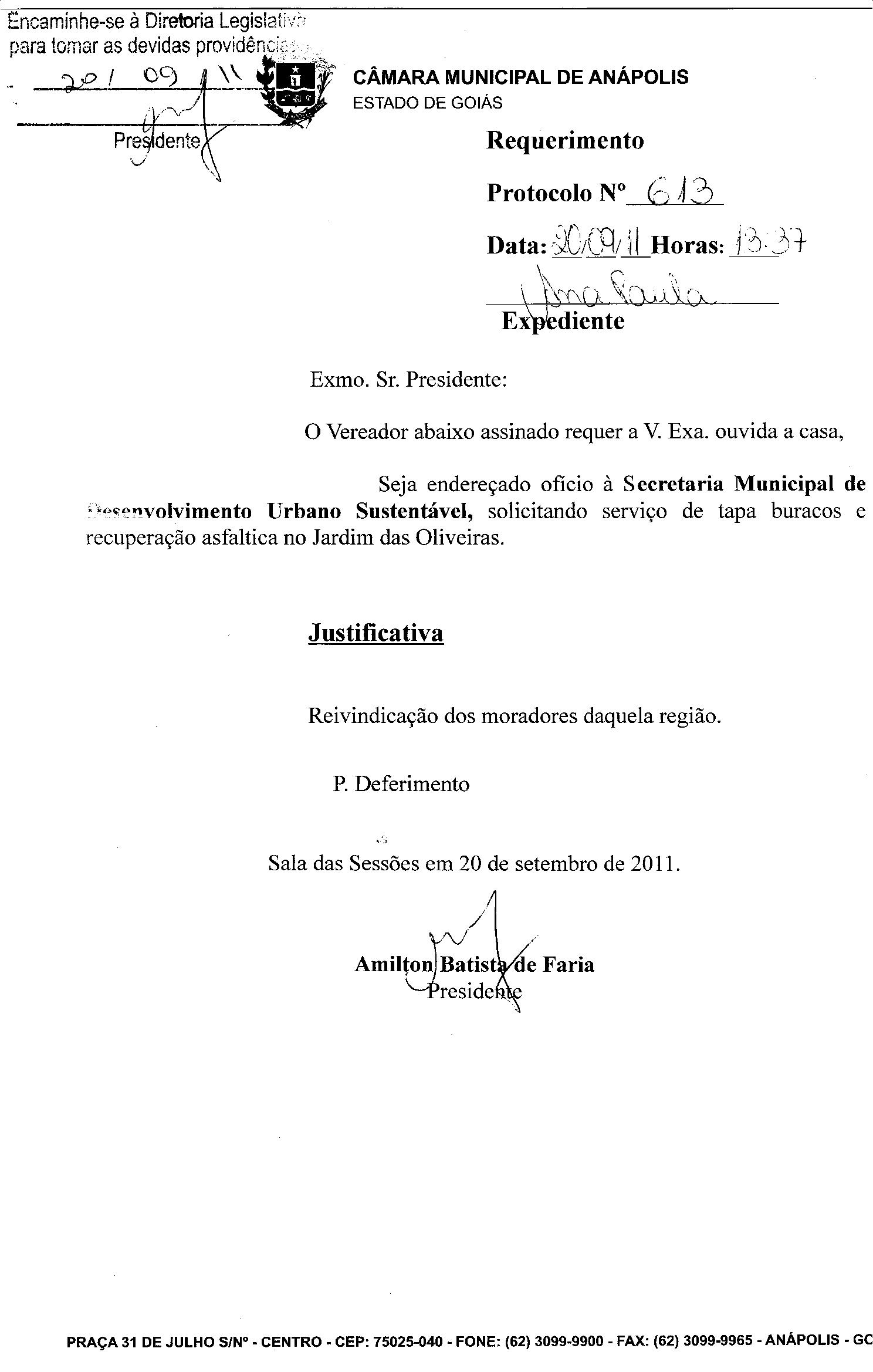 Ementa: O VERADOR ABAIXO ASSINADO REQUER A V.EXA. OUVIDA A CASA, SEJA ENDEREÇADO OFÍCIO À SECRETARIA MUNICIPAL DE DESENVOLVIMENTO URBANO SUSTENTÁVEL, SOLICITANDO SERVIÇO DE TAPA BURACOS E RECUPERAÇÃO ASFÁLTICA NO JARDIM DAS OLIVEIRAS.