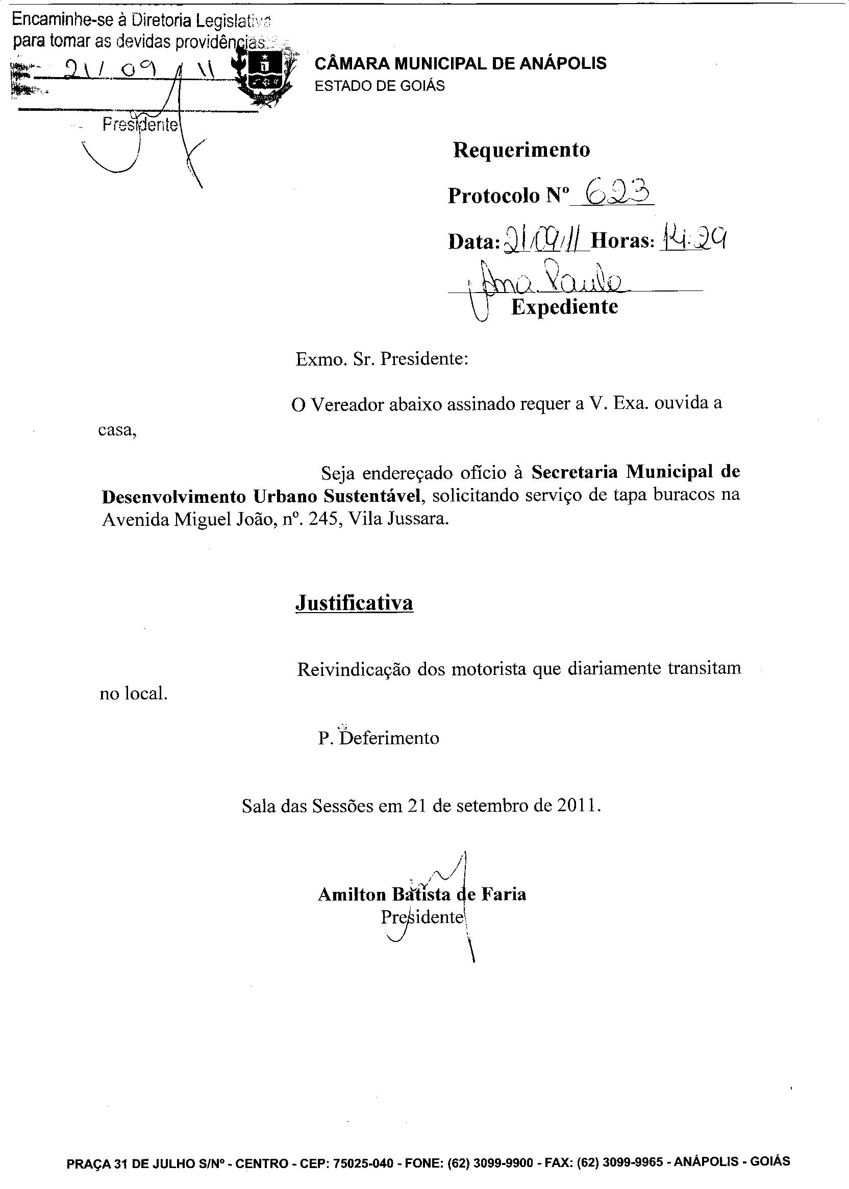 Ementa: O VEREADOR ABAIXO ASSINADO REQUER A V.EXA. OUVIDA A CASA, QUE SE OFICIE AO ÔRGÃO COMPETENTE, SEJA ENDEREÇADO OFÍCIO À SECRETARIA MUNICIPAL DE DESENVOLVIMENTO URBANO SUSTENTAVEL, SOLICITANDO SERVIÇO DE TAPA BURACOS NA AVENIDA MIGUEL JOÃO, N° 245, VILA JUSSARA.