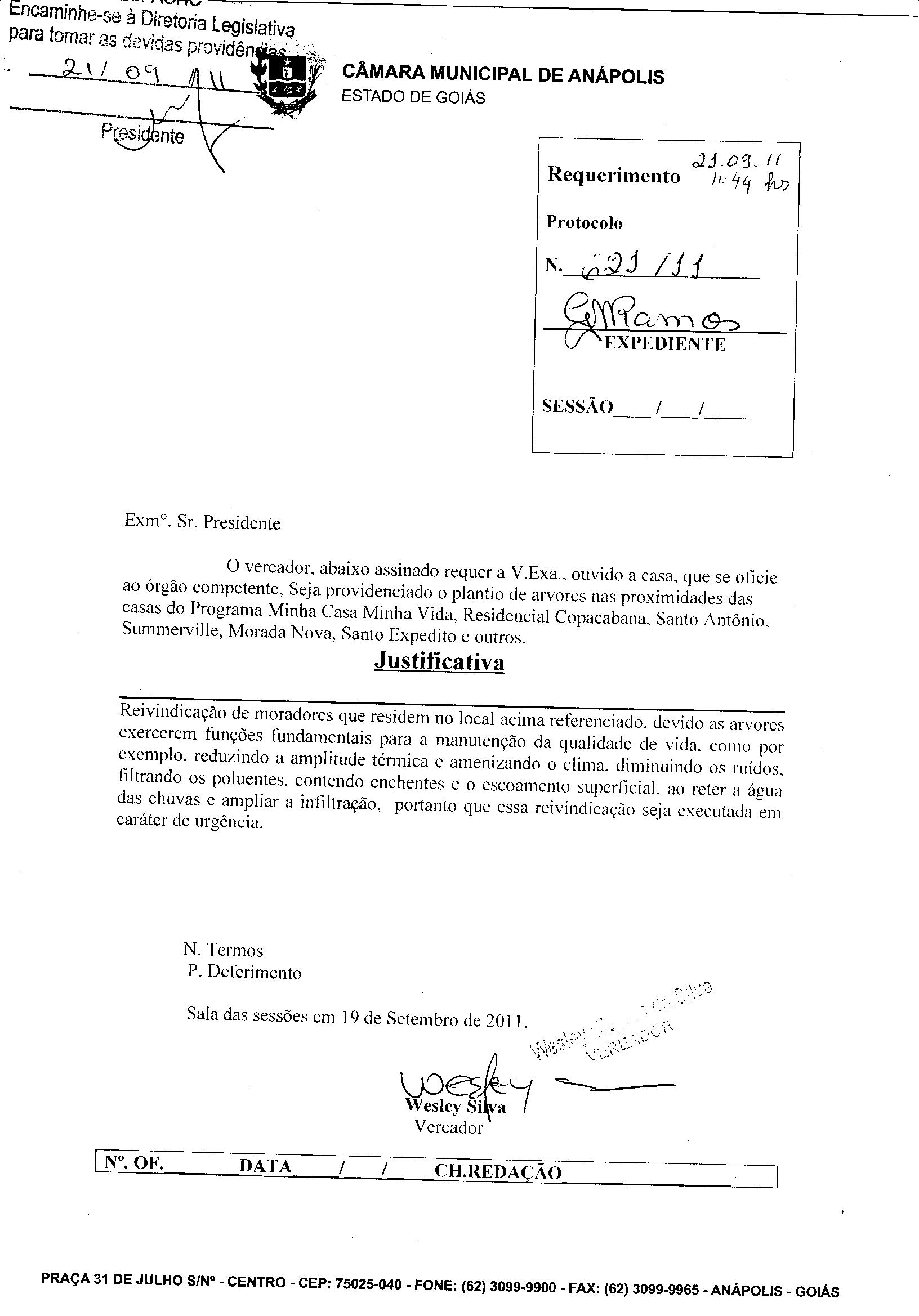 Ementa: O VEREADOR ABAIXO ASSINADO REQUER A V.EXA. OUVIDA A CASA, QUE SE OFICIE AO ÔRGÃO COMPETENTE, SEJA PROVIDENCIADO O PLANTIO DE ARVORES NAS PROXIMIDADES DAS CASAS DO PROGRAMA MINHA CASA MINHA VIDA, RESIDENCIAL COPACABANA, SANTO ANTONIO.SUMMERVILLE MORADA NOVA, SANTO EXPEDITO E OUTROS.