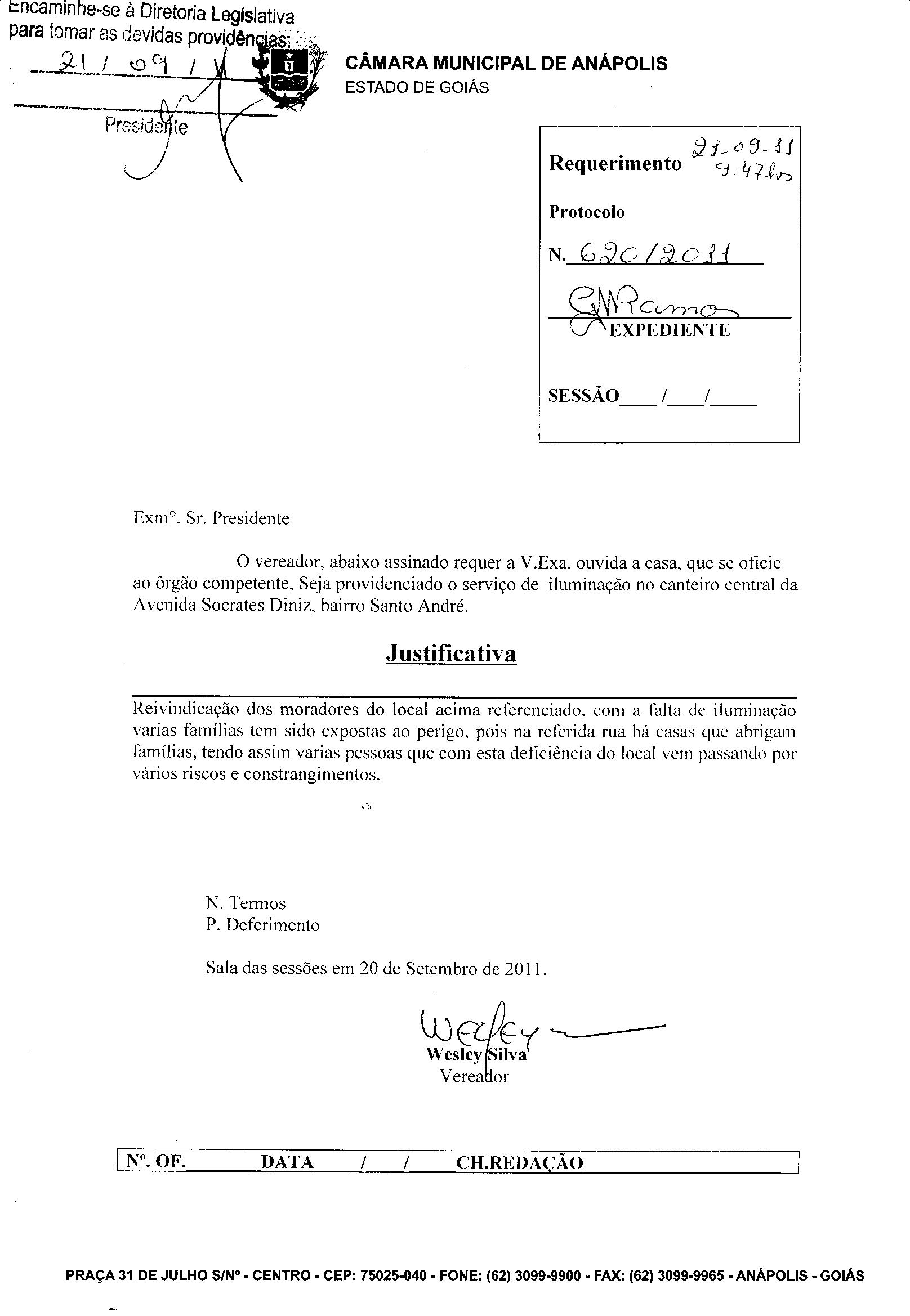 Ementa: O VEREADOR ABAIXO ASSINADO REQUER A V.EXA. OUVIDA A CASA, QUE SE OFICIE AO ÔRGÃO COMPETENTE, SEJA PROVIDENCIADO O SERVIÇO DE ILUMINAÇÃO NO CANTEIRO CENTRAL DA AVENIDA SOCRATES DINIZ, BAIRRO SANTO ANDRÉ.