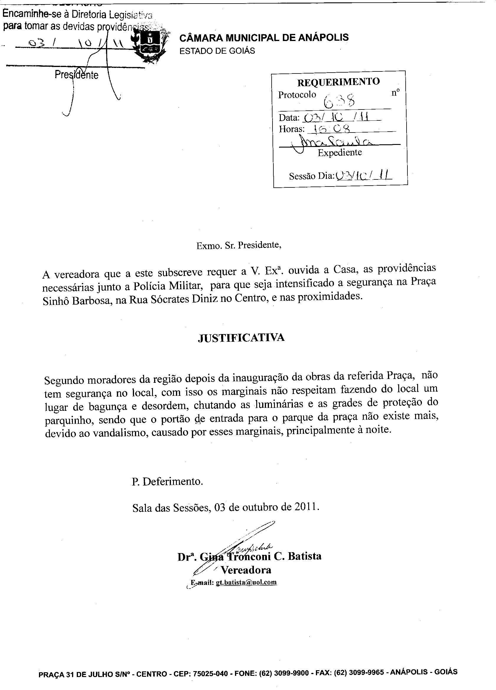 Ementa: O VEREADOR ABAIXO ASSINADO REQUER QUE VOSSA EXCELÊNCIA OUVIDA A CASA, QUE SE OFÍCIE AO ÓRGÃO COMPETENTE, SEJA PROVIDENCIADO A INTENSIFICAÇÃO DE SEGURANÇA DA PRAÇA SINHÔ BARBOSA, NA RUA SOCRATES DINIZ NO CENTRO, E NAS PROXIMIDADES