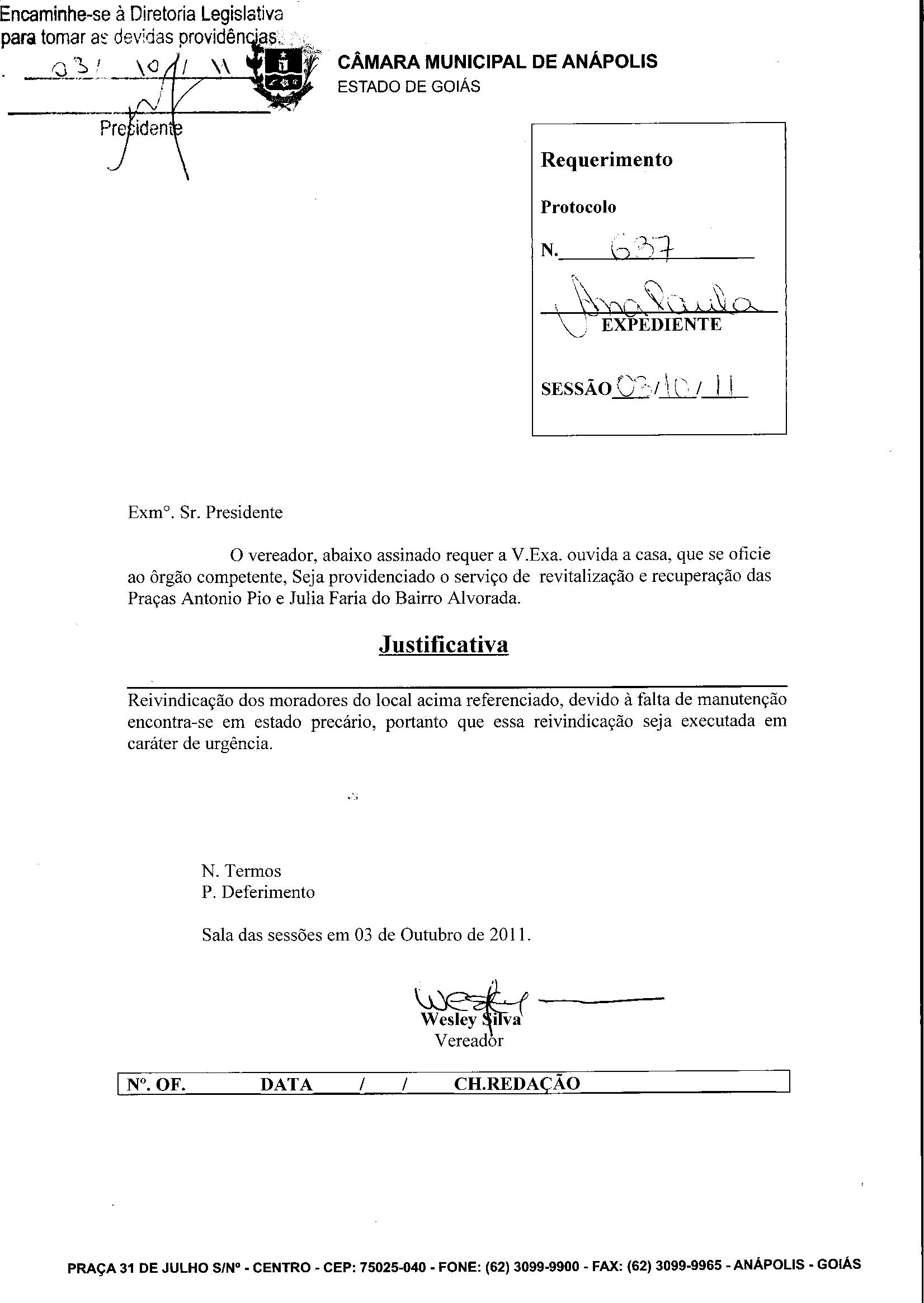 Ementa: O VEREADOR ABAIXO ASSINADO REQUER QUE VOSSA EXCELÊNCIA OUVIDA A CASA, QUE SE OFÍCIE AO ÓRGÃO COMPETENTE, SEJA PROVIDENCIADO O SERVIÇO DE REVITALIZAÇÃO E RECUPERAÇÃO DAS PRAÇAS ANTONIO PIO E JULIA FARIA DO BAIRRO ALVORADA.