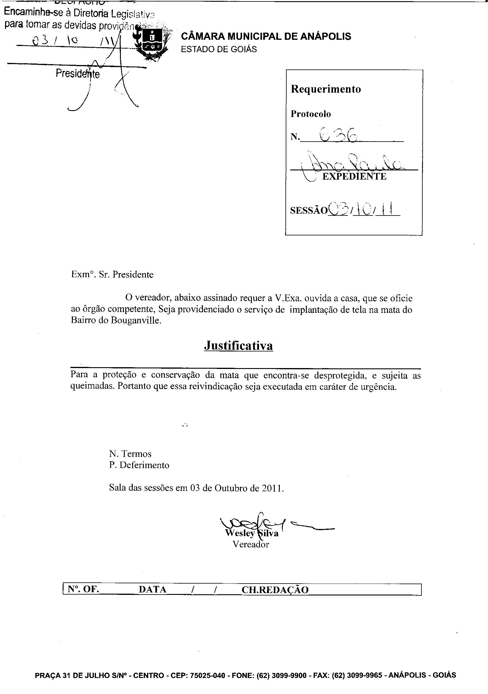 Ementa: O VEREADOR ABAIXO ASSINADO REQUER QUE VOSSA EXCELÊNCIA OUVIDA A CASA, QUE SE OFÍCIE AO ÓRGÃO COMPETENTE, SEJA PROVIDENCIADO O SERVIÇO DE IMPLANTAÇÃO DE TELA NA MATA DO BAIRRO BOUGANVILLE.