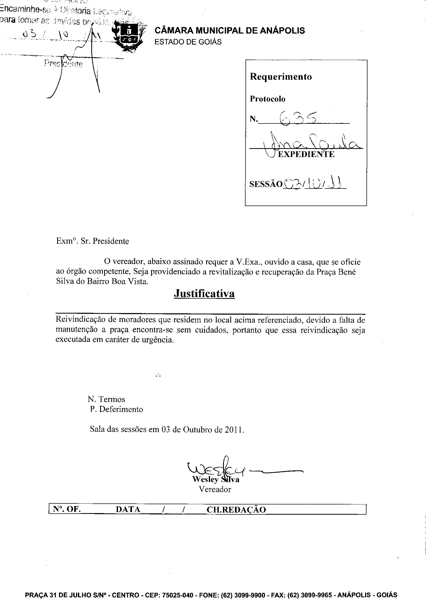 Ementa: O VEREADOR ABAIXO ASSINADO REQUER QUE VOSSA EXCELÊNCIA OUVIDA A CASA, QUE SE OFÍCIE AO ÓRGÃO COMPETENTE, SEJA PROVIDENCIADO A REVITALIZAÇÃO DA PRAÇA BENÉ SILVA DO BAIRRO BOA VISTA.