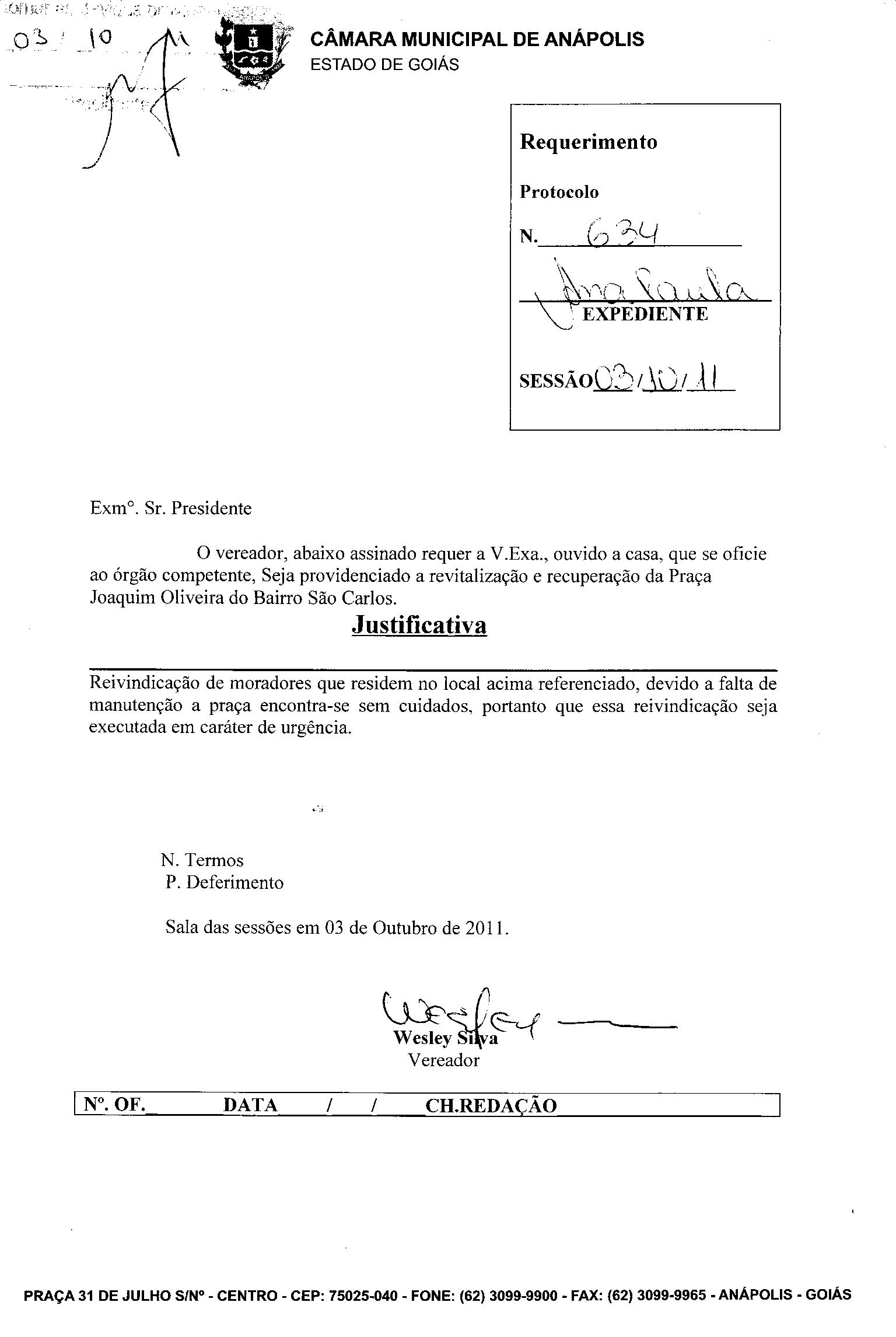 Ementa: O VEREADOR ABAIXO ASSINADO REQUER QUE VOSSA EXCELÊNCIA OUVIDA A CASA, QUE SE OFÍCIE AO ÓRGÃO COMPETENTE, SEJA PROVIDENCIADO A REVITALIZAÇÃO E RECUPERAÇÃO DA PRAÇA JOAQUIM OLIVEIRA DO BAIRRO SÃO CARLOS.