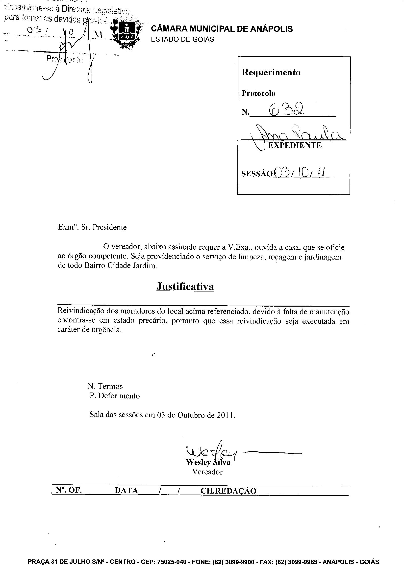 Ementa: O VEREADOR ABAIXO ASSINADO REQUER QUE VOSSA EXCELÊNCIA OUVIDA A CASA, SEJA ENDEREÇADO OFÍCIO AO ORGÃO COMPETENTE, PROVIDENCIADO O SERVIÇO DE LIMPEZA, ROÇAGEM E JARDINAGEM DE TODO BAIRRO CIDADE JARDIM.