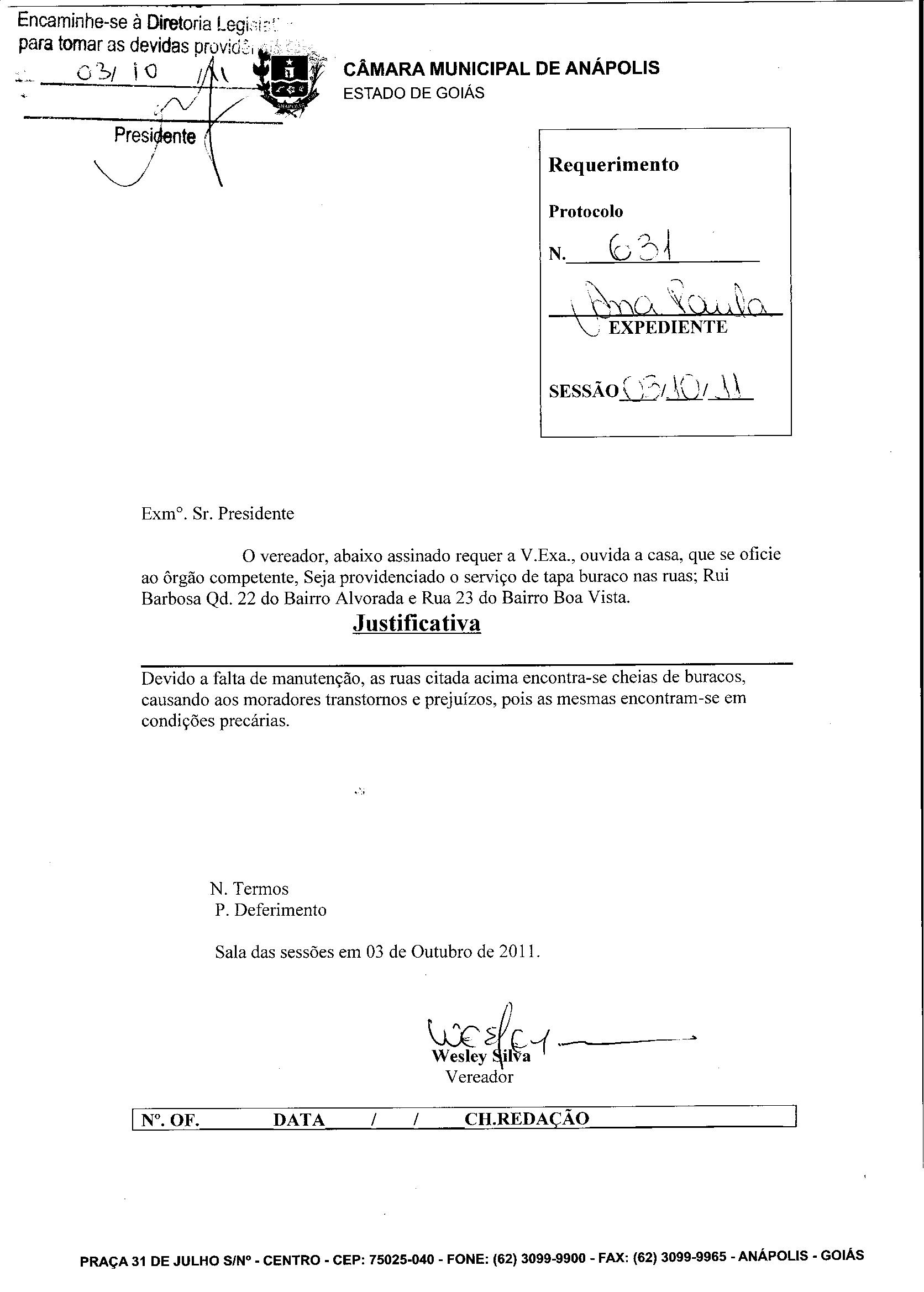 Ementa: O VEREADOR ABAIXO ASSINADO REQUER QUE VOSSA EXCELÊNCIA OUVIDA A CASA, SEJA ENDEREÇADO OFÍCIO AO ÓRGÃO COMPETENTE, SERVIÇODE TAPA BURACO NAS RUAS; RUI BARBOSA QD. 22 DO BAIRRO ALVORADA E RUA 23 DO BAIRRO BOA VISTA.