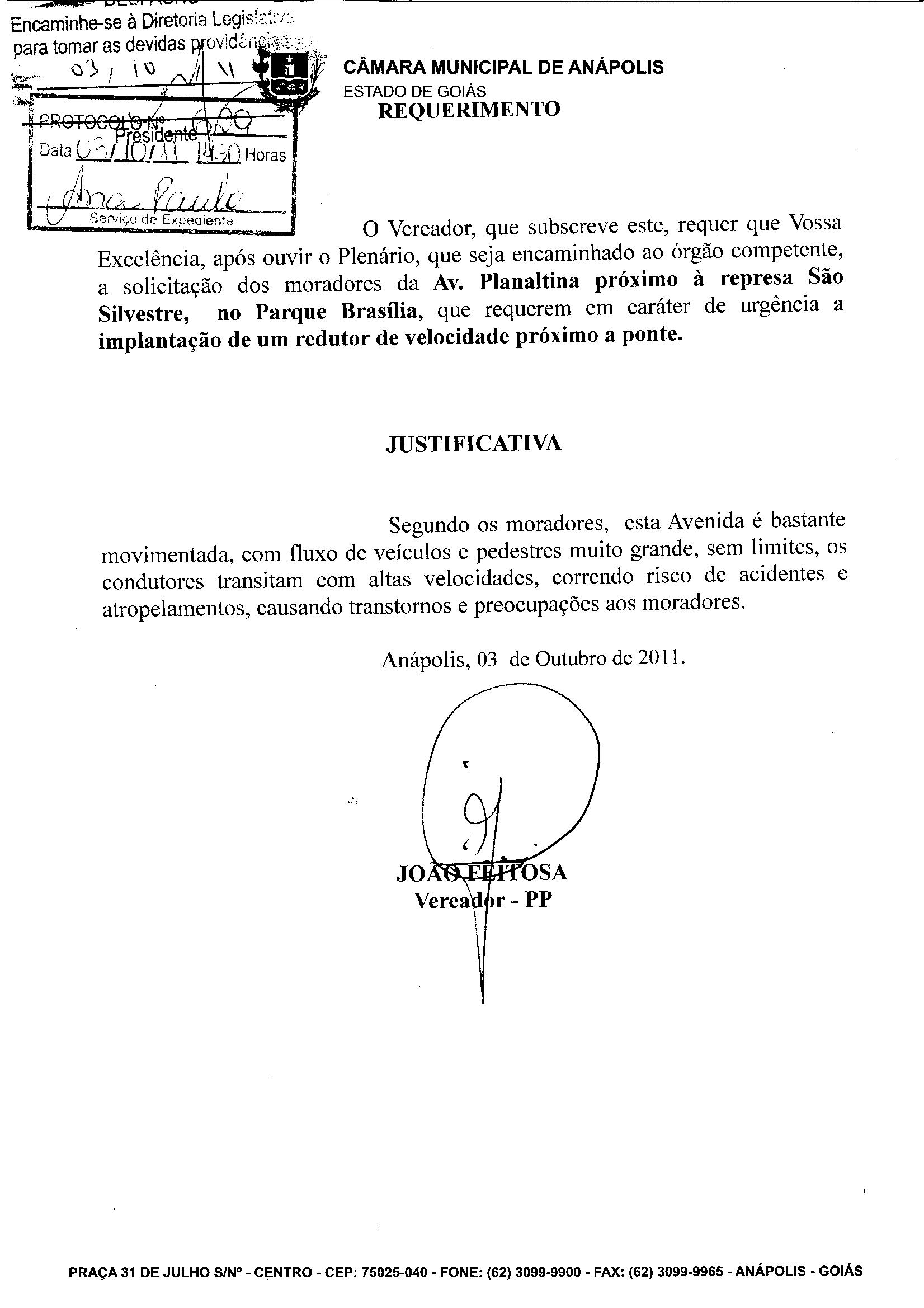 Ementa: O VEREADOR QUE ESTE SUBSCREVE, REQUER QUE VOSSA EXELÊNCIA, APÓS OUVIR O PLENARIO, QUE SEJA ENCAMINHADO AO ÓRGÃO COMPETENTE, A SOLICITAÇÃO DOS MORADORES DA AV. PLANALTINA PRÓXIMO À REPRESA SÃO SILVESTRE, NO PARQUE BRASILIA, QUE REQUEREM EM CARATER DE URGÊNCIA A IMPLANTAÇÃO DE UM REDUTOR DE VELOCIDADE PROXIMO A PONTE.