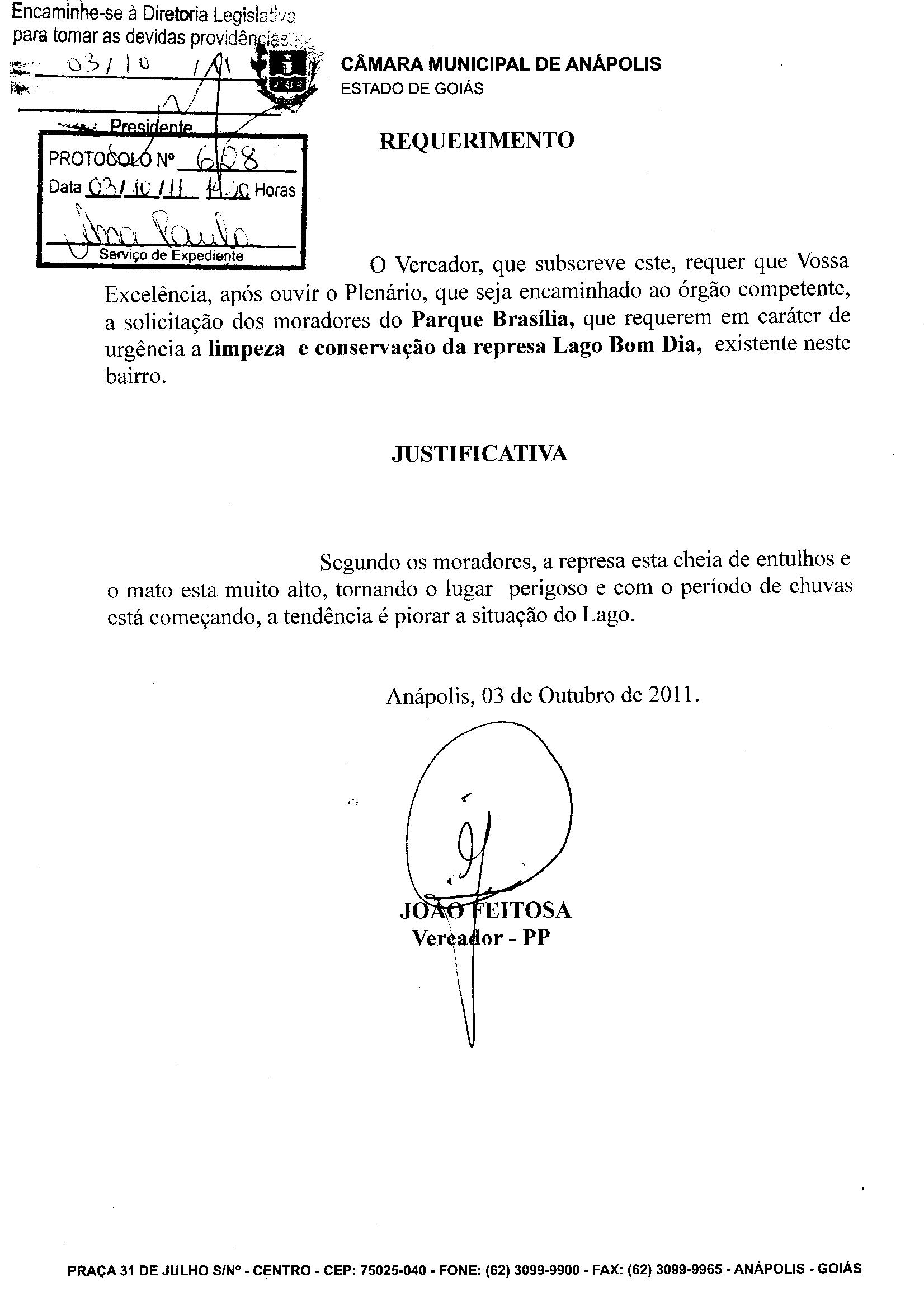 Ementa: O VEREADOR, QUE A ESTE SUBSCREVE, REQUER QUE VOSSA EXELÊNCIA, APÓS OUVIR O PLENÁRIO, QUE SEJA ENCAMINHADO AO ÓRGÃO COMPETENTE, A SOLICITAÇÃO DOS MORADORES DO PARQUE BRASILIA, QUE REQUEREM EM CARATER DE URGENCIA A LIMPEZA E CONSERVAÇÃO DA REPRESA LAGO BOM DIA, EXISTENTE NESTE BAIRRO.