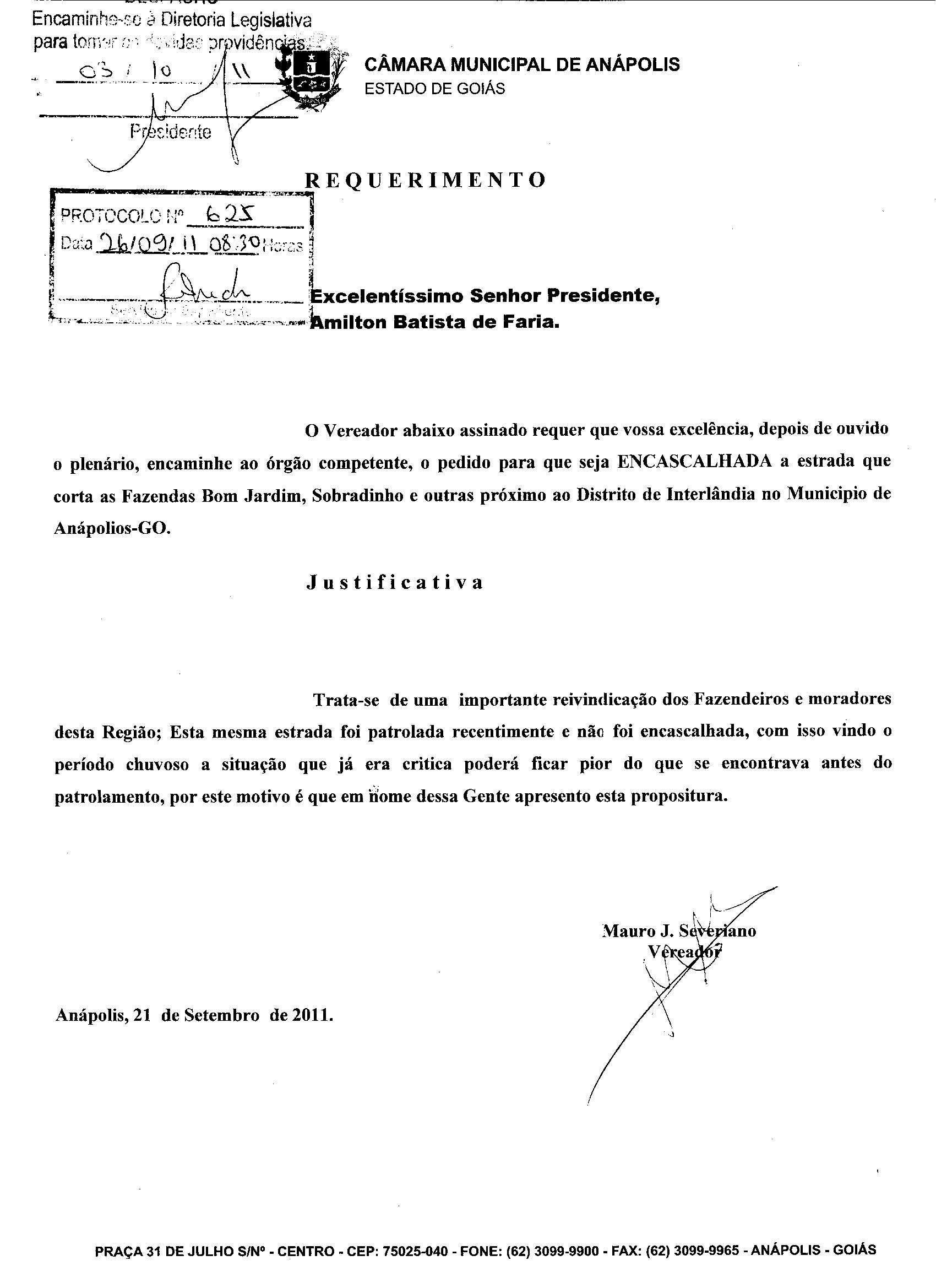 Ementa: O VEREADOR ABAIXO ASSINADO REQUER QUE VOSSA EXCELÊNCIA, DEPOIS DE OUVIDO A PLENÁRIO, ENCAMINHE AO ÓRGÃO COMPETENTE, O PEDIDO PARA QUE SEJA ENCASCALHADA A ESTRADA QUE CORTA AS FAZENDAS BOM JARDIM, SOBRADINHO E OUTRAS PRÓXIMO AO DISTRITO DE INTERLANDIA NO MUNICIPIO DE ANÁPOLIS-GO.