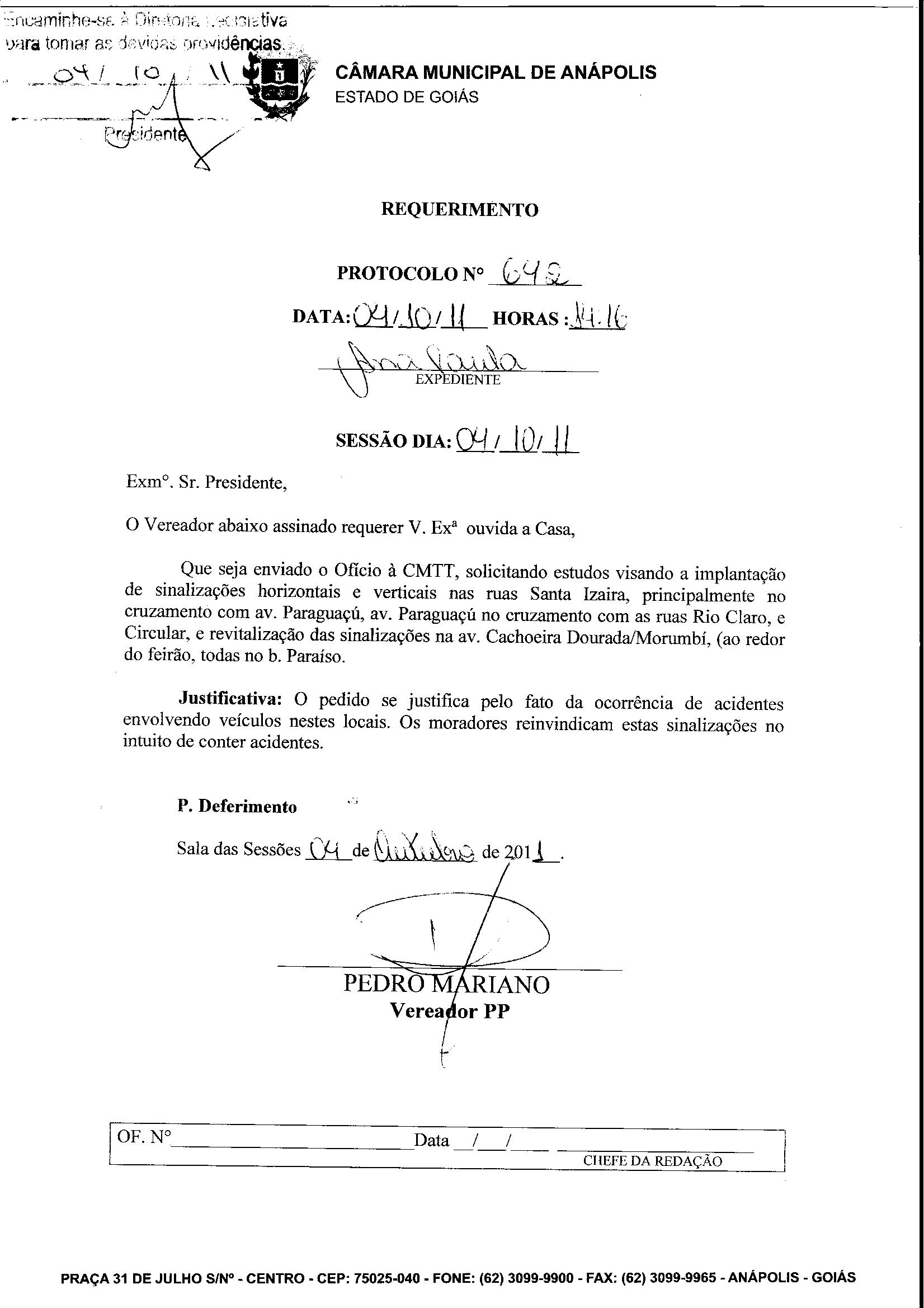 Ementa: O VEREADOR ABAIXO ASSINADO REQUER V.EXª OUVIDA A CASA, QUE SEJA ENVIADO OFÍCIO À CMTT, SOLICITANDO ESTUDOS VISANDO A IMPLANTAÇÃO DE SINALIZAÇÕES HORIZONTAIS E VERTICAIS NAS RUAS SANTA IZAIRA, PRICIPALMENTE NO CRUZAMENTO COM AV. PARAGUAÇÚ NO CRUZAMENTO COM AS RUAS RIO CLARO, E CIRCULAR,E REVITALIZAÇÃO DAS SINALIZAÇÕES NA AV. CACHOEIRA DOURADA/MORUMBI, (AO REDOR DO FEIRÃO, TODAS NO B. PARAISO.