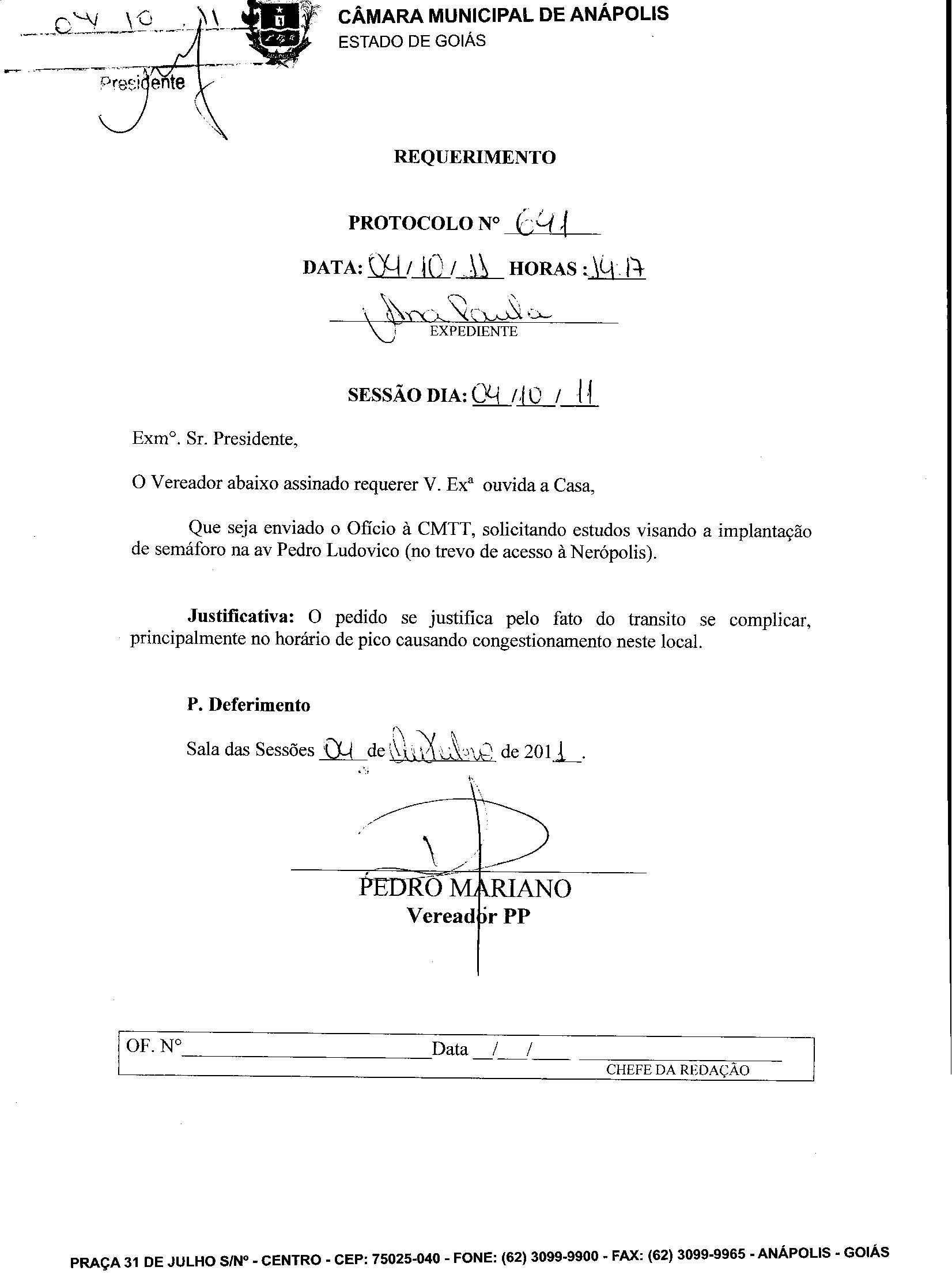 Ementa: O VEREADOR ABAIXO ASSINADO REQUER V.EXª OUVIDA A CASA, QUE SEJA ENVIADO O OFÍCIO À CMTT, SOLICITANDO ESTUDOS VISANDO A IMPLANTAÇÃO DE SEMÁFORO NA AV PEDRO LUDOVICO (NO TREVO DE ACESSO À NERÓPOLIS).