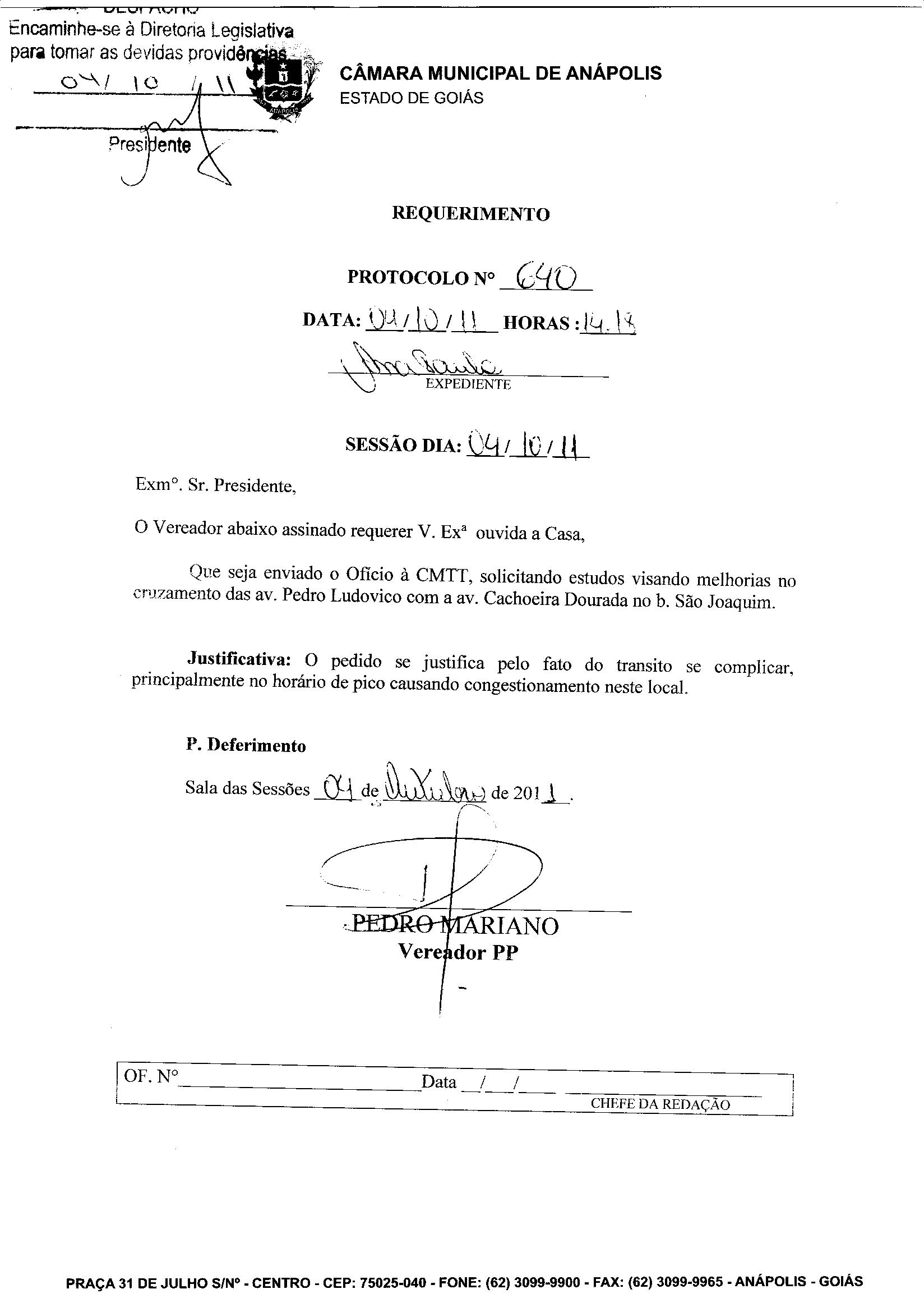 Ementa: O VEREADOR ABAIXO ASSINADO REQUER V.EXª OUVIDA A CASA, QUE SEJA ENVIADO O OFÍCIO À CMTT, SOLICITANDO ESTUDOSVISANDO MELHORIAS NO CRUZAMENTO DAS AV. PEDRO LUDOVICO COM A AV. CACHOEIRA DOURADA NO BAIRRO SÃO JOAQUIM.