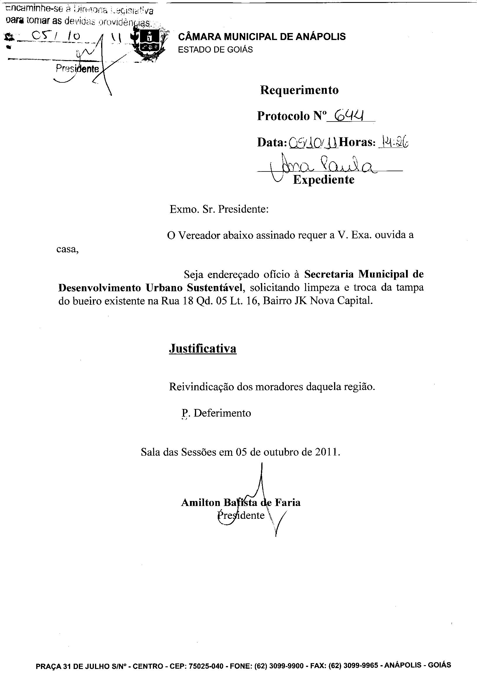 Ementa: O VEREADOR ABAIXO ASSINADO REQUER A V.EXA.OUVIDA A CASA, SEJA ENDEREÇADO OFÍCIO À SECRETARIA MUNICIPAL DE DESENVOLVIMENTO URBANO SUSTENTÁVÉL, SOLICITANDO LIMPEZA E TROCA DA TAMPA DO BUEIRO EXISTENTE NA RUA 18 QD.05 LT.16, BAIRRO JK NOVA CAPITAL.