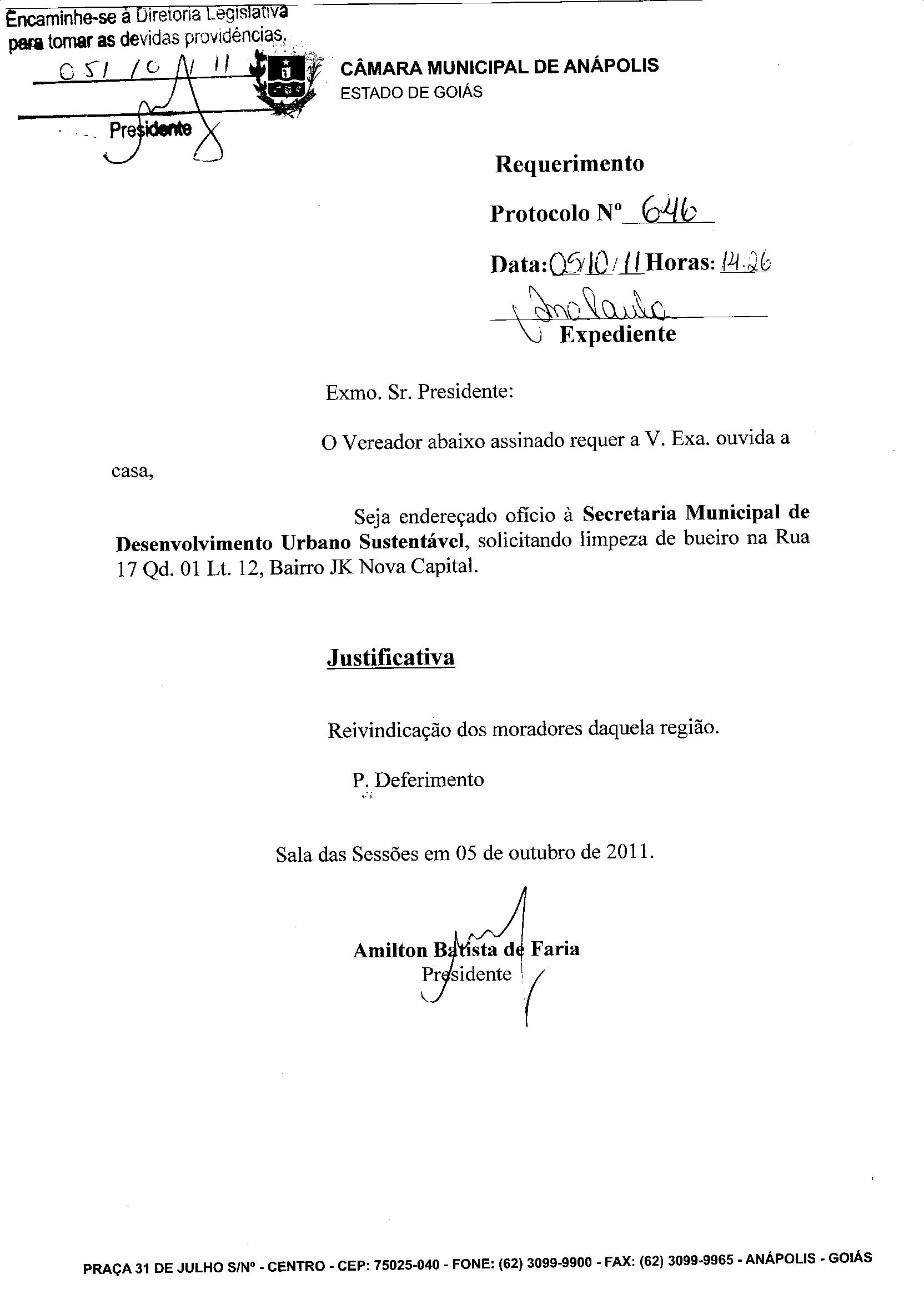 Ementa: O VEREADOR ABAIXO ASSINADO REQUER A V.EXA. OUVIDA A CASA, SEJA ENDEREÇADO OFÍCIO À SECRETARIA MUNICIPAL DE DESENVOLVIMENTO URBANO SUSTENTÁVEL, SOLICITANDO LIMPEZA DE BUEIRO NA RUA 17 QD. 01 LT.12, BAIRRO JK NOVA CAPITAL.