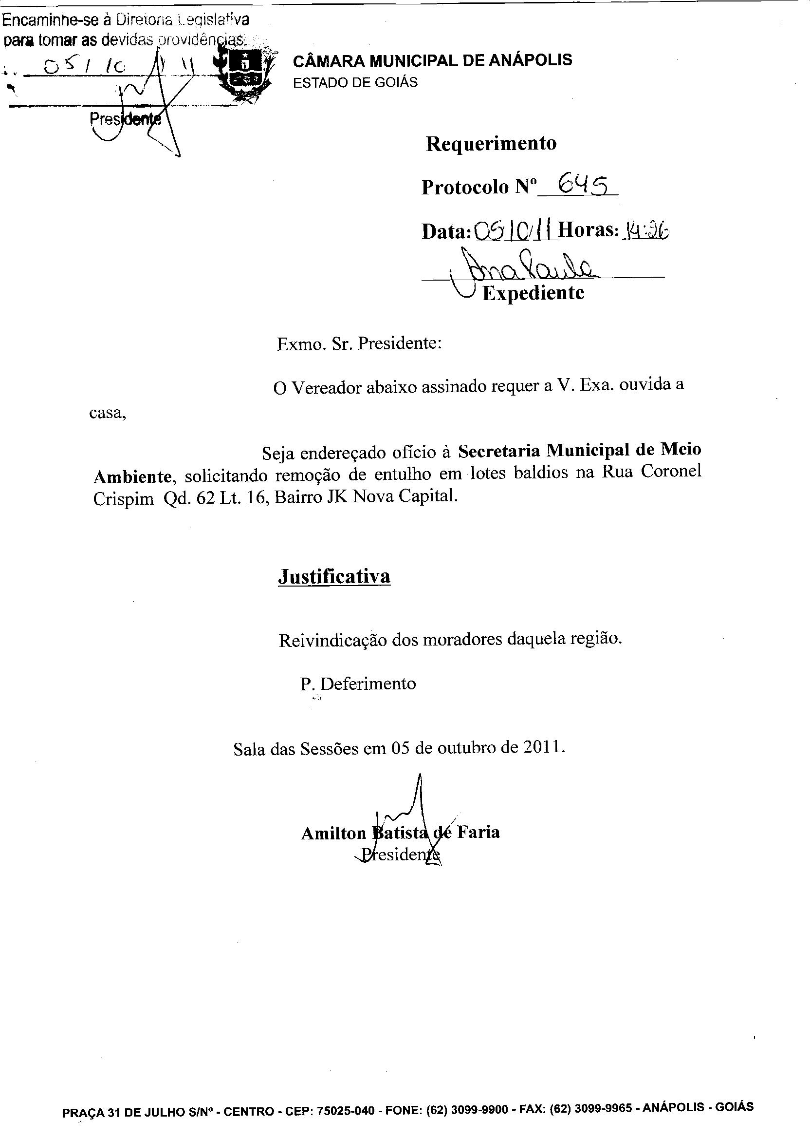 Ementa: O VEREADOR ABAIXO ASSINADO REQUER A V. EXA. OUVIDA A CASA, SEJA ENDEREÇADO OFÍCIO À SECRETARIA MUNICIPAL DE MEIO AMBIENTE, SOLICITANDO REMOÇÃO DE ENTULHO EM LOTES BALDIOS NA RUA CORONEL CRISPIM QD. 62 LT.16, BAIRRO JK NOVA CAPITAL.