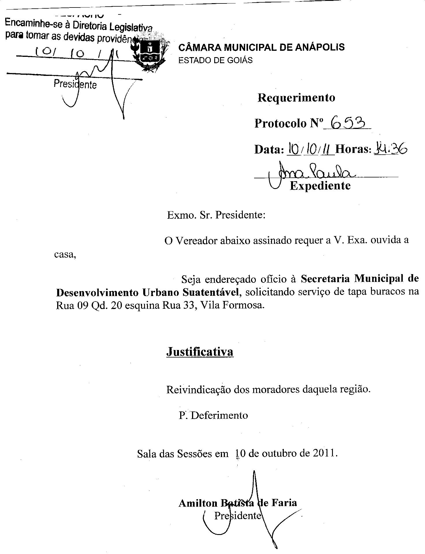 Ementa: O VEREADOR ABAIXO ASSINDAO REQUER A V.EXA. OUVIDA A CASA, SEJA ENDEREÇADO OFÍCIO À SECRETARIA MUNICIPAL DE DESENVOLVIMENTO URBANO SUSTENTÁVEL, SOLICITANDO SERVIÇO DE TAPA BURACOS NA RUA 09 QD. 20 ESQUINA RUA 33, VILA FORMOSA.