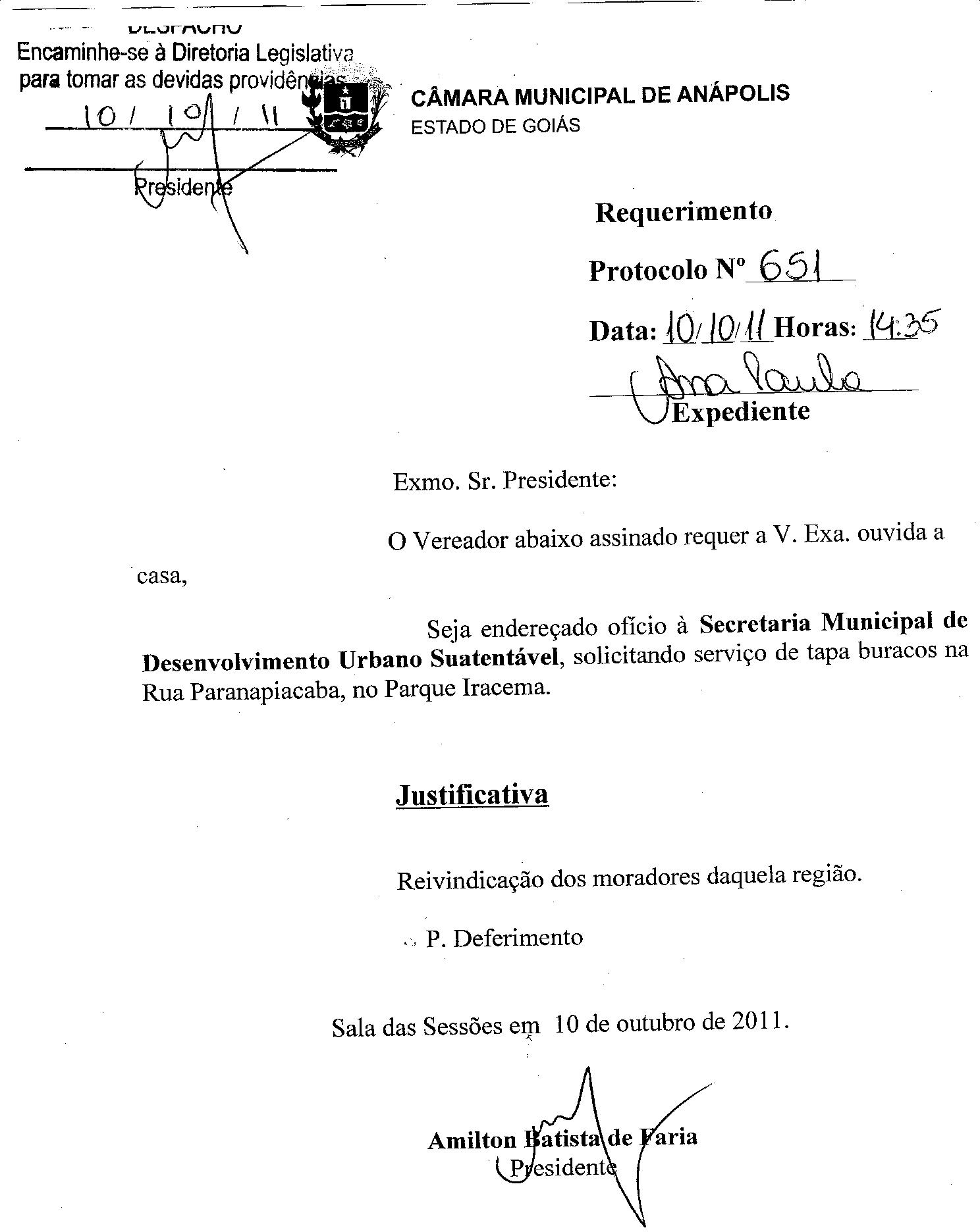 Ementa: O VEREADOR ABAIXO ASSINADO REQUER A V.EXA. OUVIDA A CASA, SEJA ENDEREÇADO OFÍCIO À SECRETARIA MUNICIPAL DE DESENVOLVIMENTO URBANO SUSTENTÁVEL, SOLICITANDO SERVIÇO DE TAPA BURACOS NA RUA PARANAPIACABA, NO PARQUE IRACEMA.