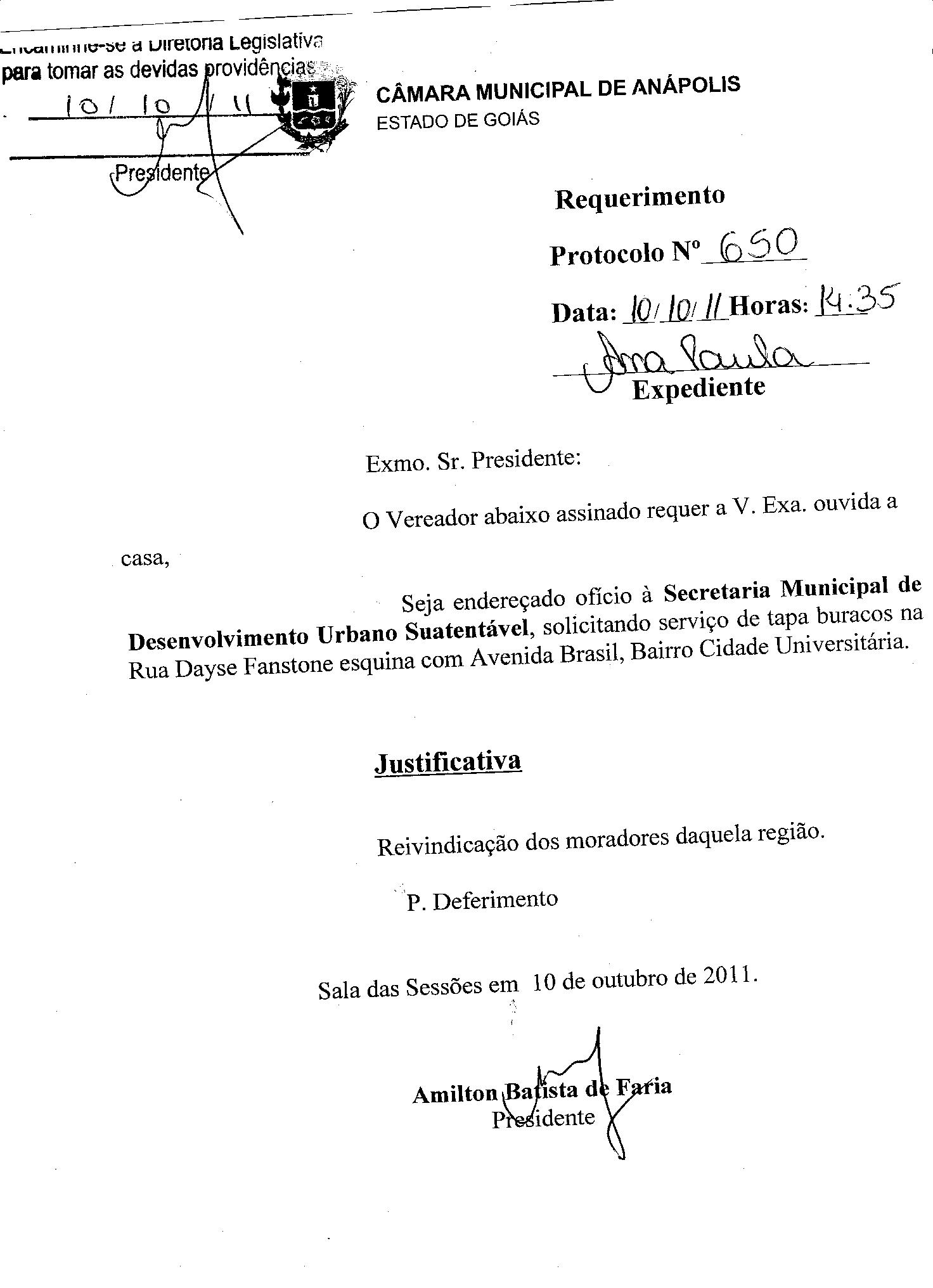 Ementa: O VEREADOR ABAIXO ASSINADO REQUER A V.EXA. OUVIDA A CASA, SEJA ENDEREÇADO OFÍCIO À SECRETARIA MUNICIPAL DE DESENVOLVIMENTO URBANO SUSTENTÁVEL, SOLICITANDO SERVIÇO DE TAPA BURACOS NA RUA DAYSE FANSTONE ESQUINA COM AVENIDA BRASIL, BAIRRO CIDADE UNIVERSITÁRIA.