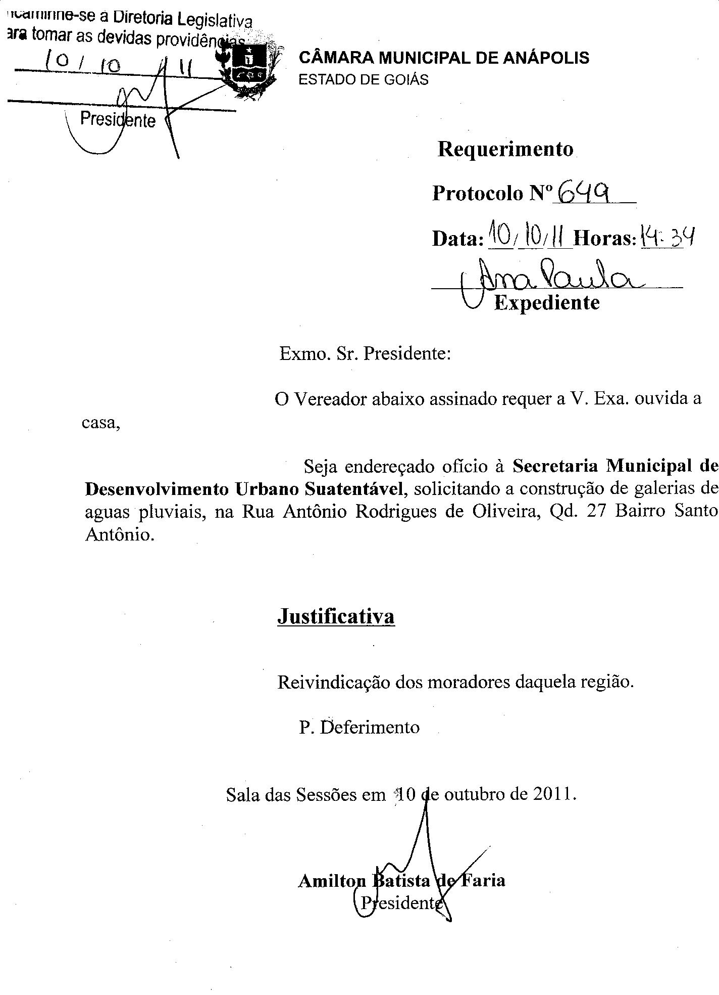 Ementa: O VEREADOR ABAIXO ASSINADO REQUER A V.EXA. OUVIDA A CASA, SEJA ENDEREÇADO OFÍCIO À SECRETARIA MUNICIPAL DE DESENVOLVIMENTO URBANO SUSTENTÁVEL, SOLICITANDO A CONSTRUÇÃO DE GALERIAS DE AGUAS PLUVIAIS, NA RUA ANTÔNIO RODRIGUES DE OLIVEIRA, QD. 27 BAIRRO SANTO ANTÔNIO.