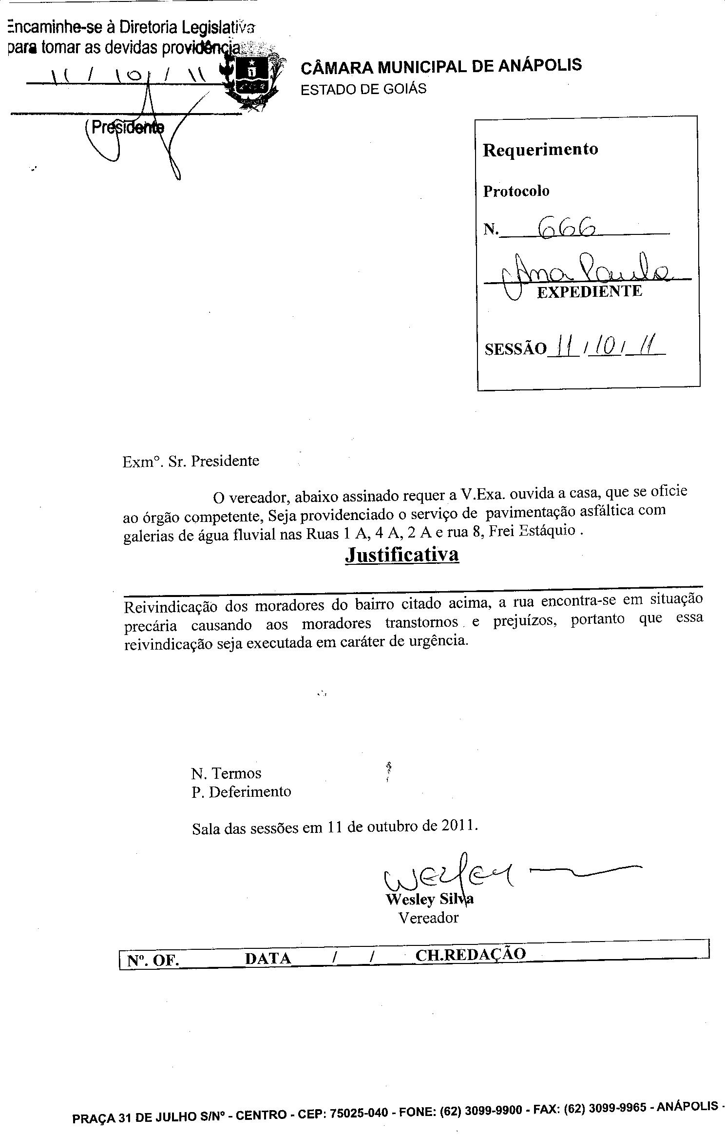 Ementa: O VEREADOR, ABAIXO ASSINADO REQUER A V.EXA. OUVIDA A CASA, QUE SE OFÍCIE AO ÓRGÃO COMPETENTE, SEJA PROVIDENCIADO O SERVIÇO DE PAVIMENTAÇÃO ASFÁLTICA COM GALERIAS DE ÁGUA FLUVIAL NAS RUAS 1A, 4A, 2A E RUA 8, FREI EUSTAQUIO.