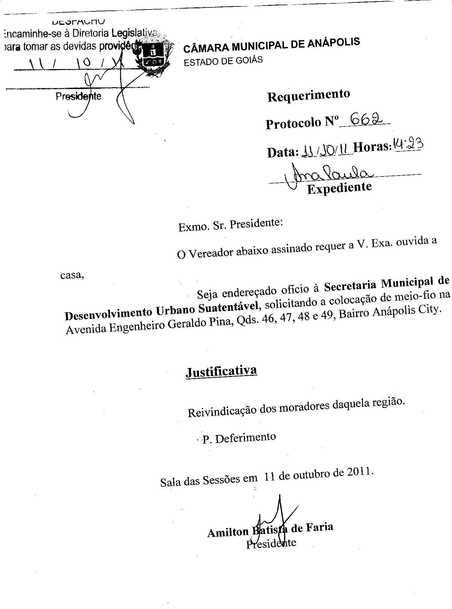 Ementa: O VEREADOR ABAIXO ASSINADO REQUER A V.EXA. OUVIDA A CASA, SEJA ENDEREÇADO OFÍCIO À SECRETARIA MUNICIPAL DE DESENVOLVIMENTO URBANO SUSTENTÁVEL, SOLICITANDO A COLOCAÇÃO DE MEIO-FEIO NA AVENIDA ENGENHEIRO GERALDO PINA, QDS. 46,47, 48 E 49, BAIRRO ANÁPOLIS CITY.