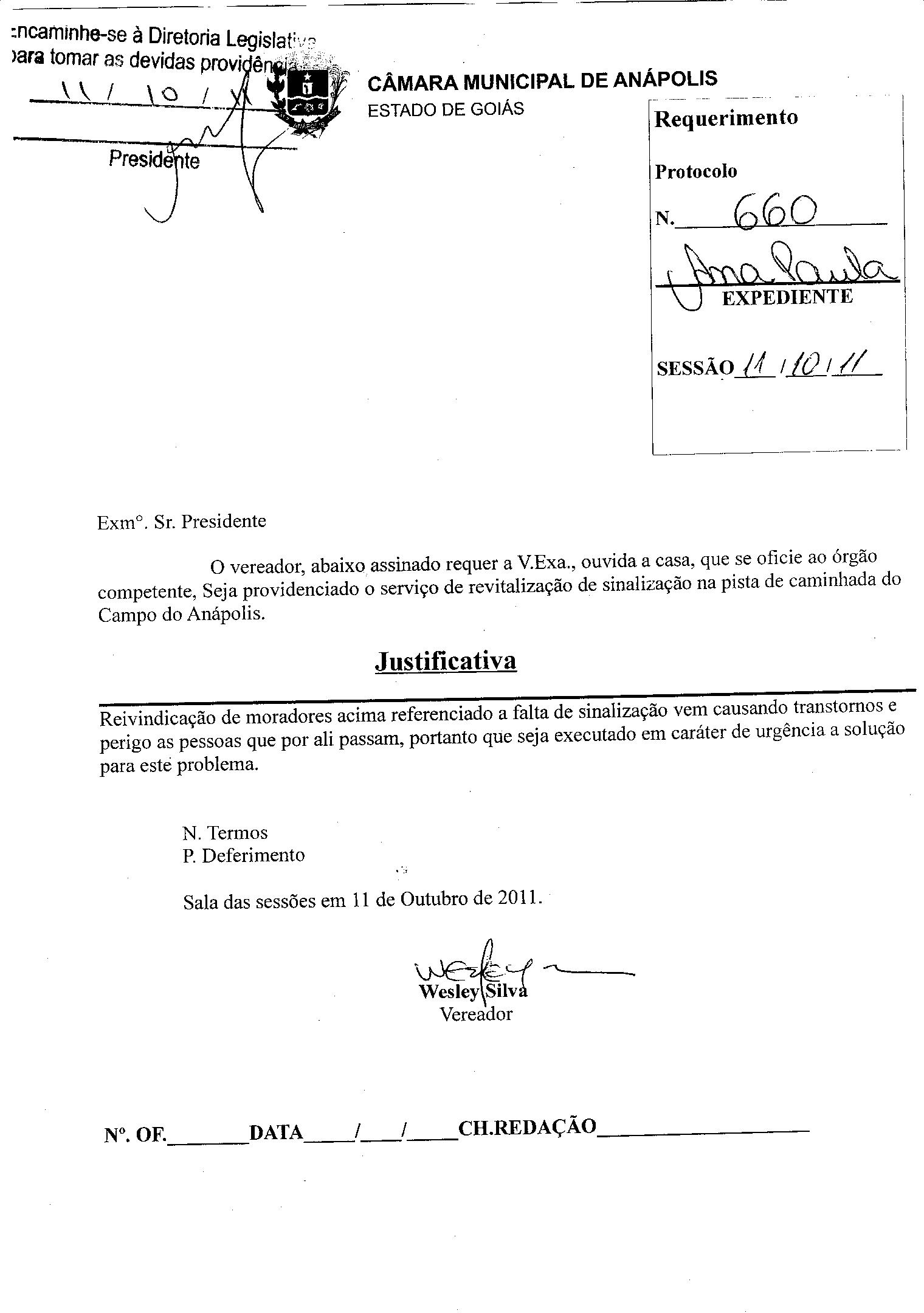 Ementa: O VEREADOR, ABAIXO ASSINADO REQUER A V.EXA., OUVIDA A CASA, QUE SE OFÍCIE AO ÓRGÃO COMPETENTE, SEJA PROVIDENCIADO O SERVIÇO DE REVITALIZAÇÃO DE SINALIZAÇÃO NA PISTA DE CAMINHADA DO CAMPO DO ANÁPOLIS.