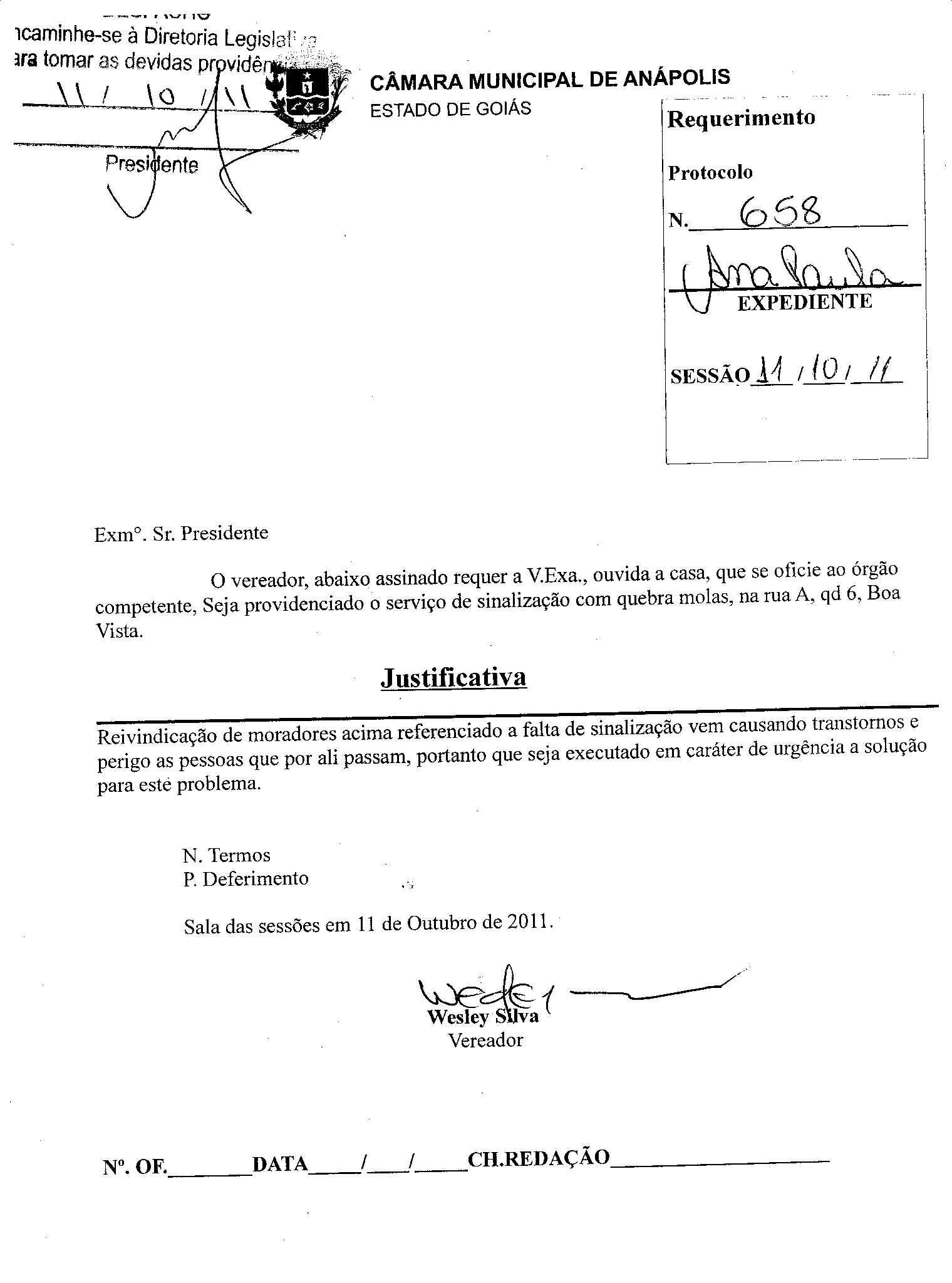 Ementa: O VEREADOR, ABAIXO ASSINADO REQUER A V.EXA., OUVIDA A CASA, QUE SE OFÍCIE AO ÓRGÃO COMPETENTE, SEJA PROVIDENCIADO O SERVIÇO DE SINALIZAÇÃO COM QUEBRA MOLAS, NA RUA, QD 6, BOA VISTA