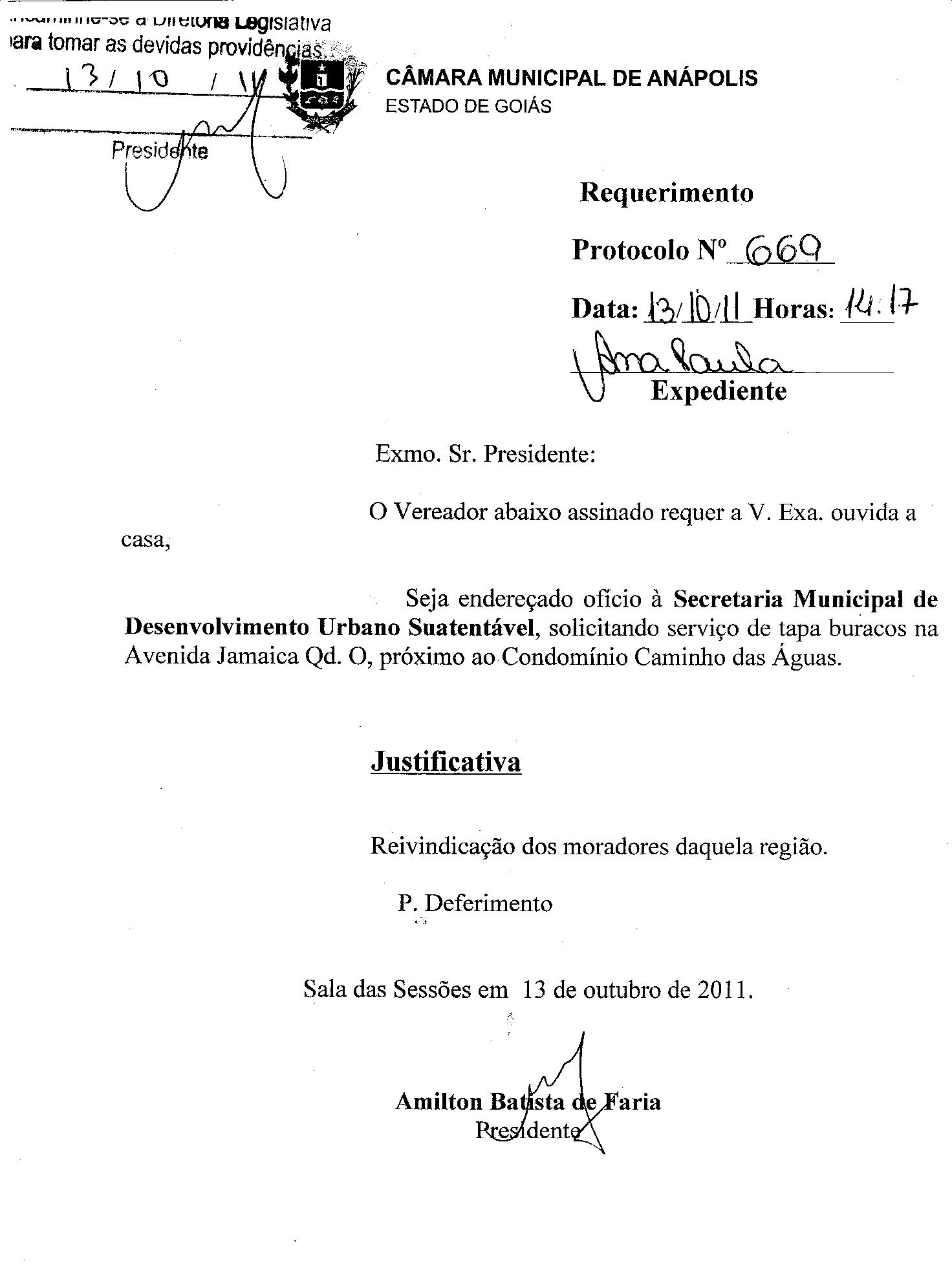 Ementa: O VEREADOR ABAIXO ASSINADO REQUER A V.EXA OUVIDA A CASA, SEJA ENDEREÇADO OFÍCIO À SECRETARIA MUNICIPAL DE DESENVOLVIMENTO URBANO SUSTENTAVEL, SOLICITANDO SERVIÇO DE TAPA BURACOS NA AVENIDA JAMAICA QD. O, PROXIMO AO CONDOMÍNIO CAMINHO DAS ÁGUAS.