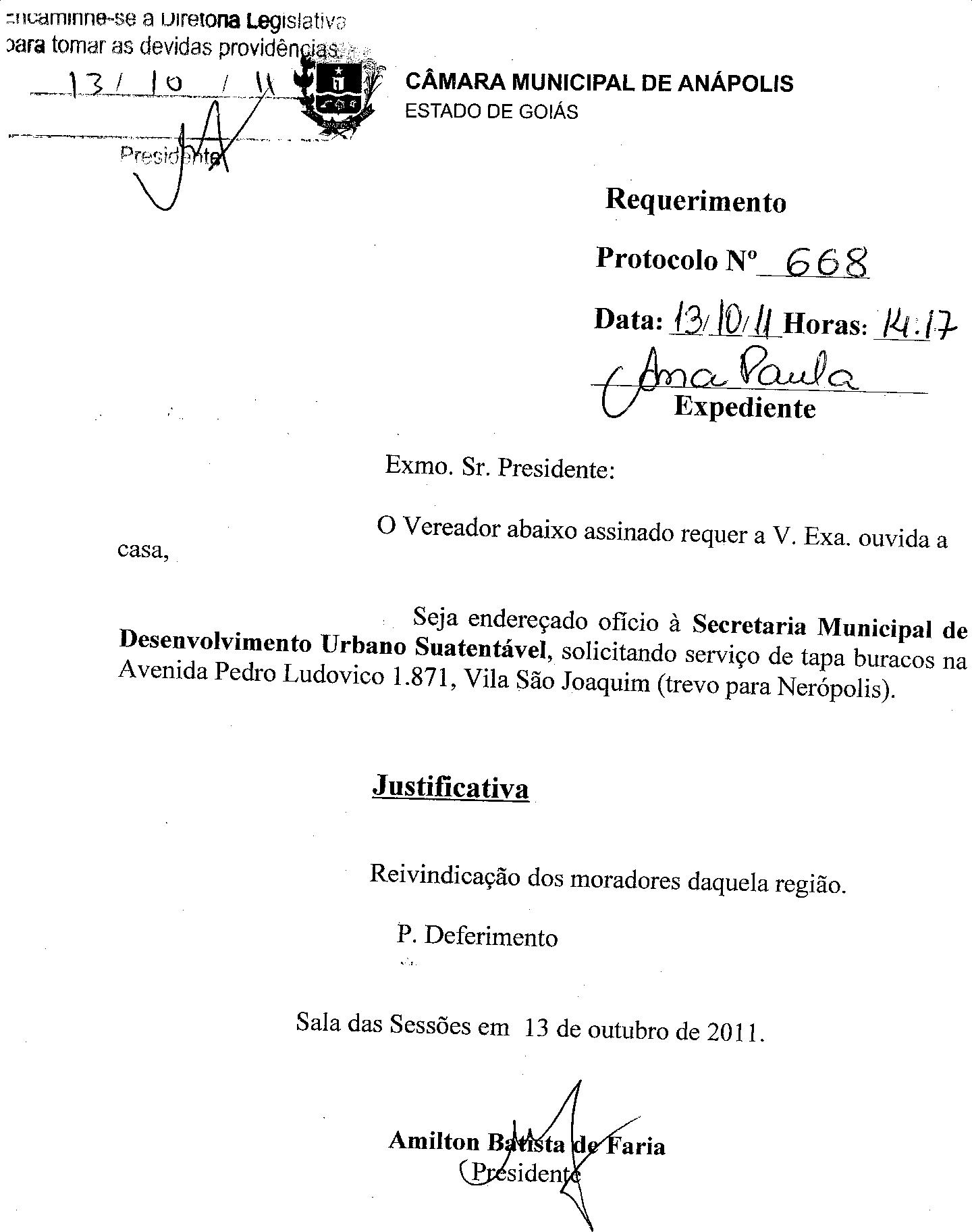 Ementa: O VEREADOR ABAIXO ASSINADO REQUER A V.EXA OUVIDA A CASA, SEJA ENDEREÇADO OFÍCIO À SECRETARIA MUNICIPAL DE DESENVOLVIMENTO URBANO SUSTENTAVEL, SOLICITANDO SERVIÇO DE TAPA BURACOS NA AVENIDA PEDRO LUDOVICO 1.871, VILA SÃO JOAQUIM (TREVO PARA NERÓPOLIS)
