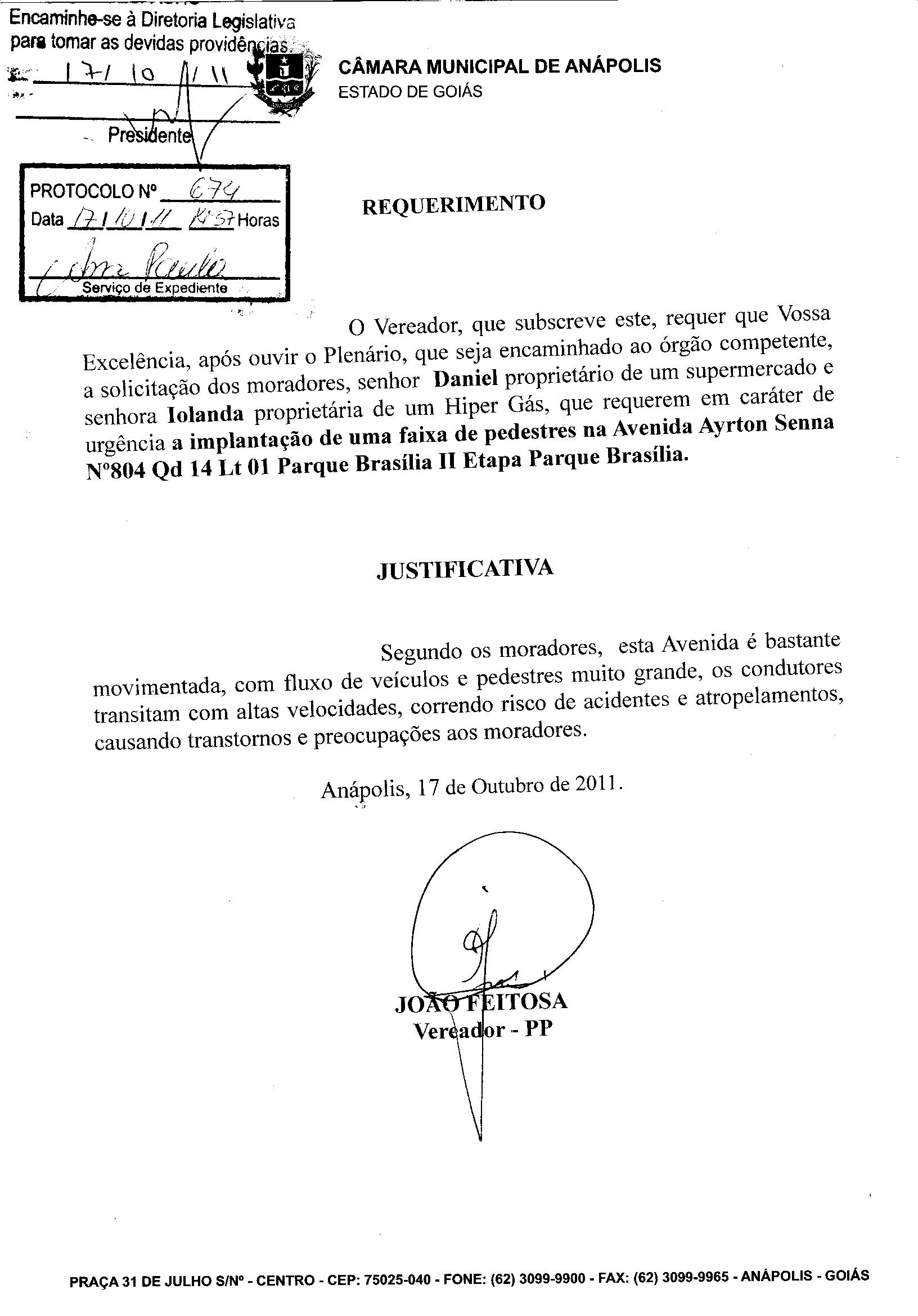 Ementa: O VEREADOR, QUE SUBSCREVE ESTE, REQUER QUE VOSSA EXCELÊNCIA, APÓS OUVIR O PLENÁRIO, QUE SEJA ENCAMINHADO AO ÓRGÃO COMPETENTE, A SOLICITAÇÃO DOS MORADORES, SENHOR DANIEL PROPRIETÁRIO DE UM SUPERMECADO E SE ]NHORA IOLANDA PROPRIETÁRIA DE HIPER GÁS, QUE REQUEREM EM CARATER DE URGÊNCIA A IMPLANTAÇÃO DE UMA FAIXA DE PEDESTRES NA AVENIDA AYRTON SENNA N°804 QD 14 LT 01 II ETAPA PARQUE BRASILIA.