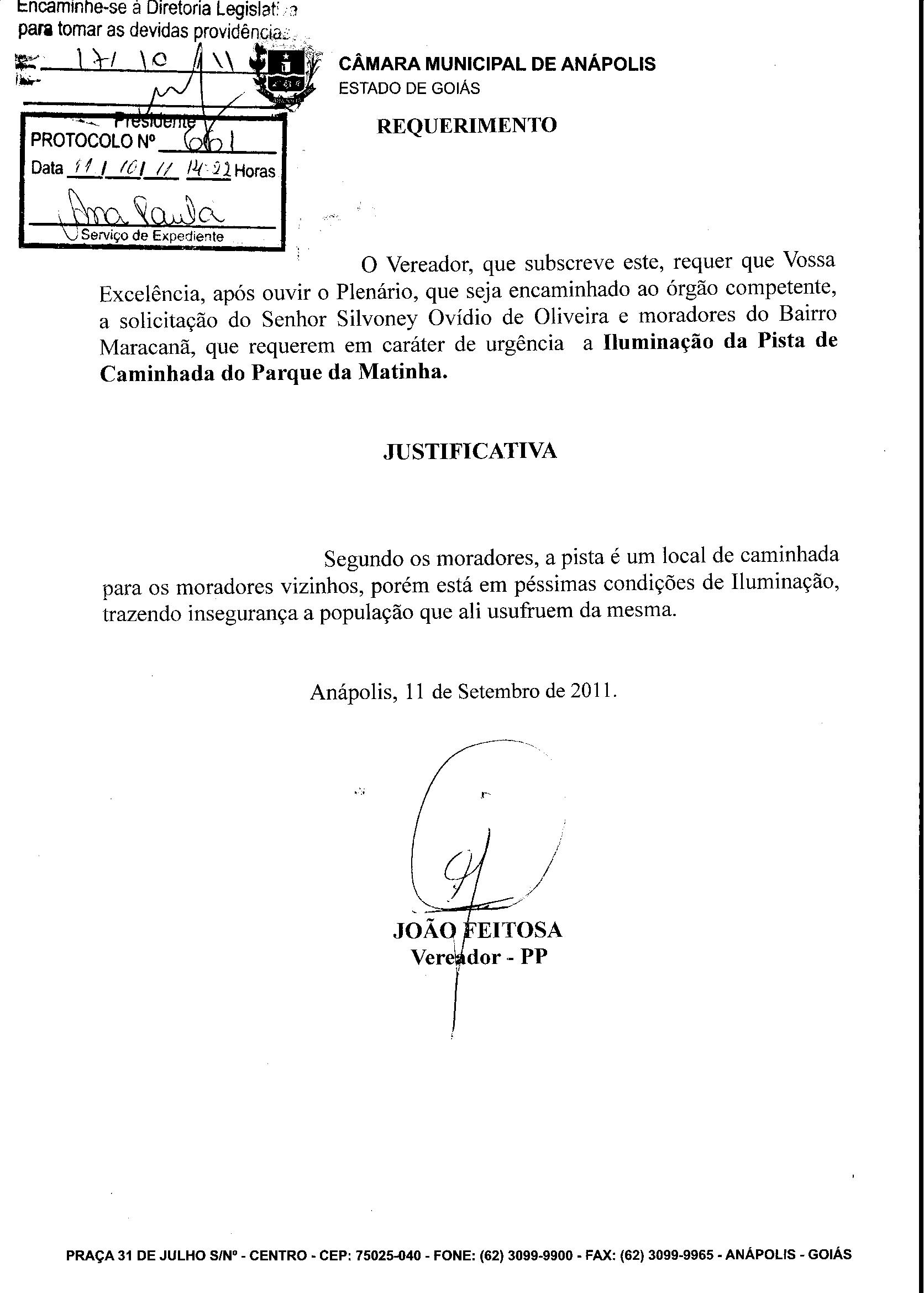 Ementa: O VEREADOR, QUE SUBSCREVE ESTE, REQUER QUE VOSSA EXCELÊNCIA, APÓS OUVIR O PLENÁRIO, QUE SEJA ENCAMINHADO AO ÓRGÃO COMPETENTE, A SOLICITAÇÃO DO SENHOR SILVONEY OVÍDIO DE OLIVEIRA E MORADORES DO BAIRRO MARACANÃ QUE REQUEREM EM REQUEREM EM CARATER DE ÛRGENCIA A ILUMINAÇÃO DA PISTA DE CAMINHADA DO PARQUE DA MATINHA.