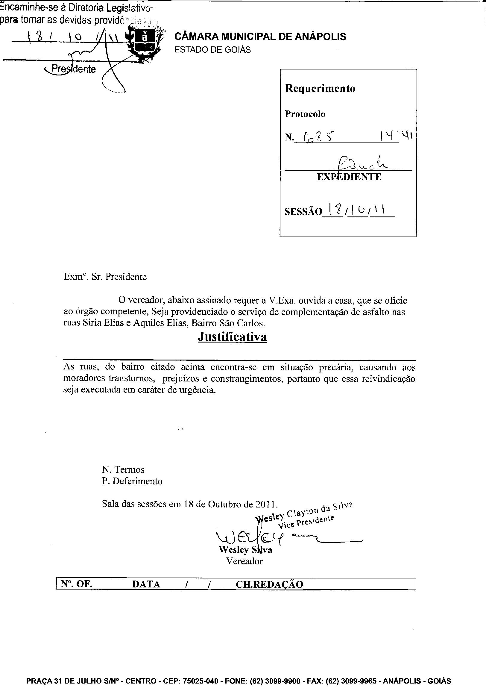 Ementa: O VEREADOR, ABAIXO ASSINADO REQUER A V.EXA,. OUVIDA A CASA, QUE SE OFICIE AO ÓRGÃO COMPETENTE, SEJA PROVIDENCIADO O SERVIÇO DE COMPLEMENTAÇÃO DE ASFALTO NAS RUAS SIRIA ELIAS E AQUILES ELIAS, BAIRRO SÃO CARLOS.