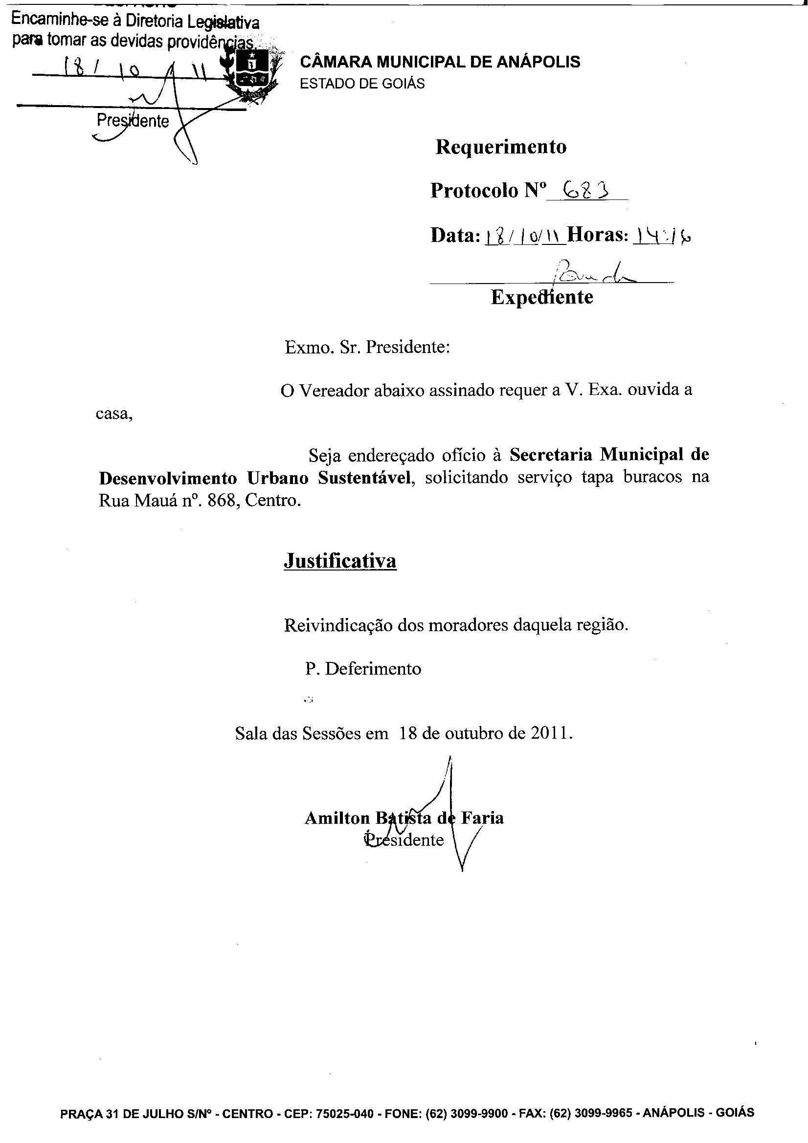 Ementa: VEREADOR ABAIXO ASSINADO REQUER A V.EXA, OUVIDA A CASA, SEJA ENDEREÇADO OFÍCIO À SECRETARIA MUNICIPAL DE DESENVOLVIMENTO URBANO SUSTENTÁVEL, SOLICITANDO SERVIÇO TAPA BURACOS NA RUA MAUÁ N°. 868, CENTRO.