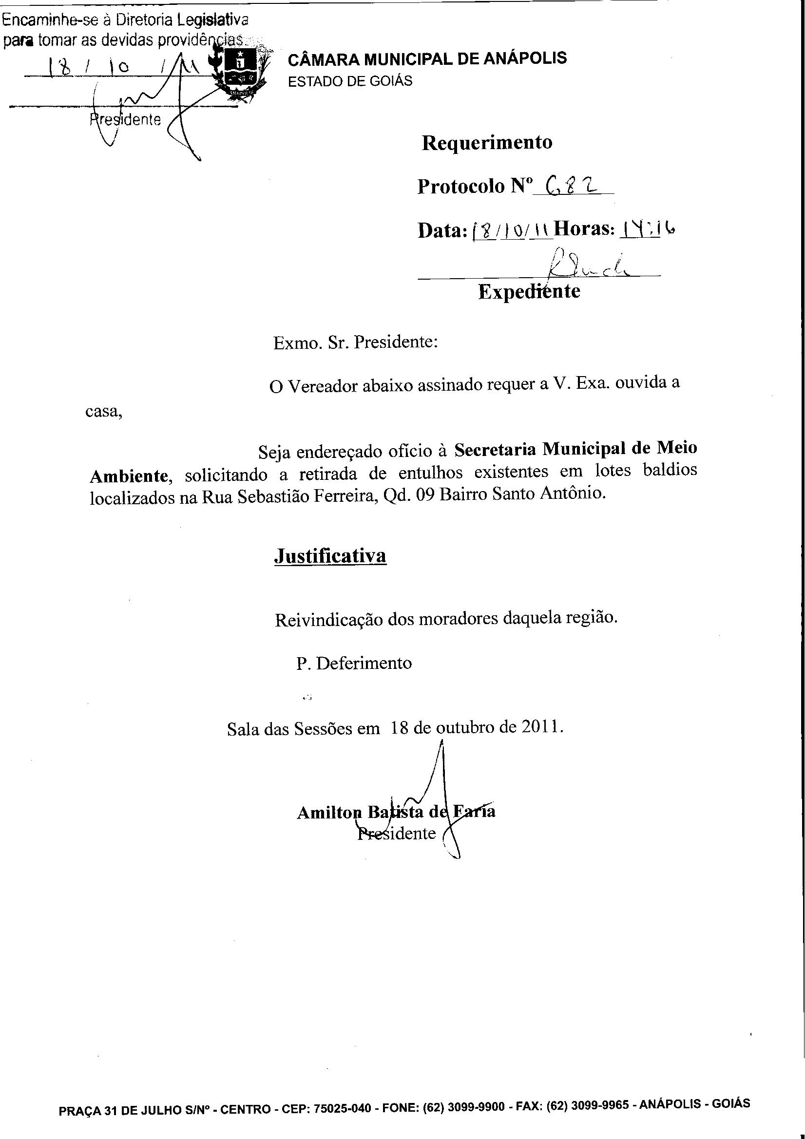 Ementa: O VEREADOR ABAIXO ASSINADO REQUER A V.EXA, OUVIDA A CASA, SEJA ENDEREÇADO OFÍCIO À SECRETARIA MUNICIPAL DE MEIO AMBIENTE, SOLICITANDO A RETIRADA DE ENTULHOS EXISTENTES EM LOTES LOCALIZADOS NA RUA SEBASTIÃO FERREIRA, QD.09 BAIRRO SANTO ANTÔNIO.