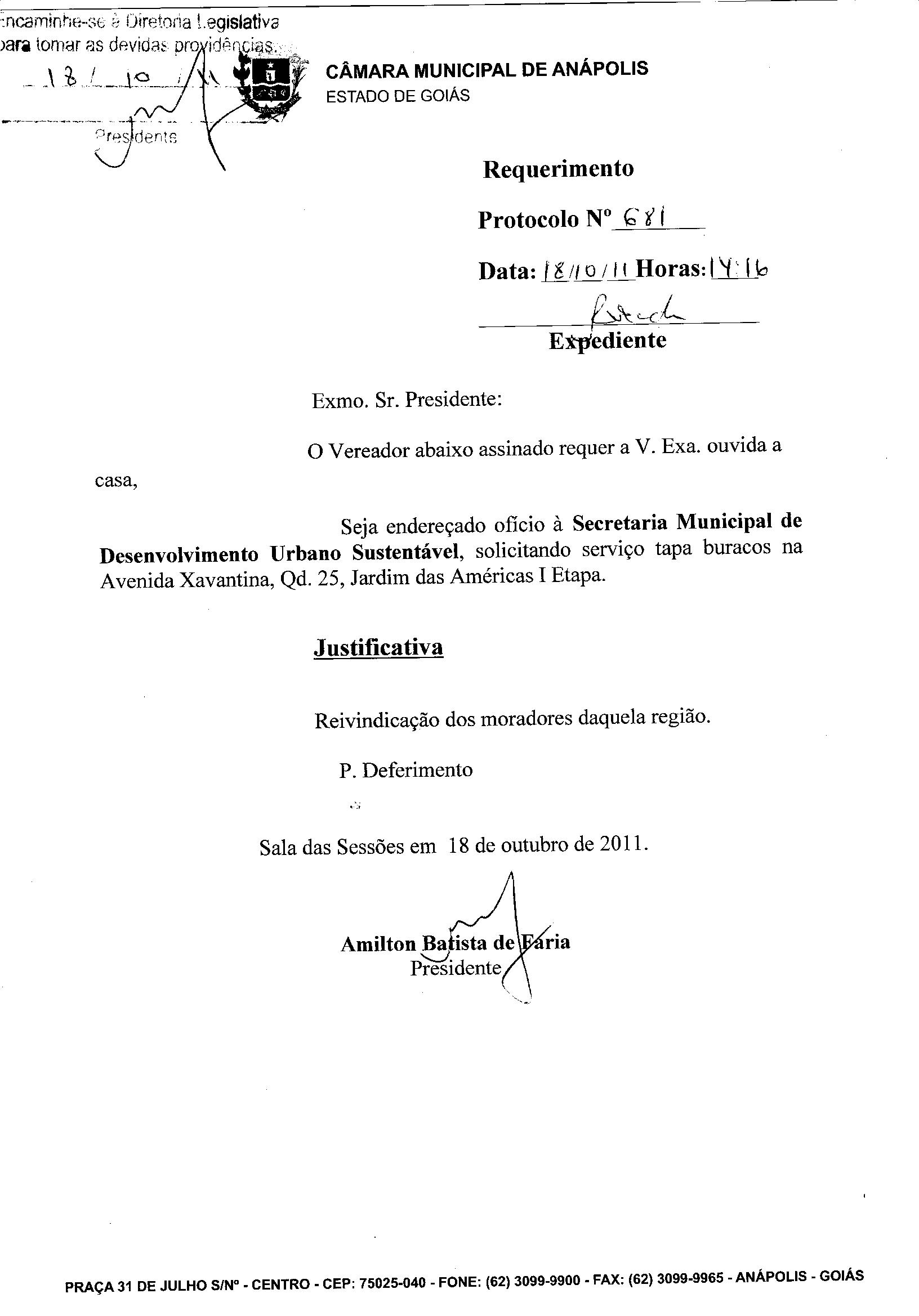 Ementa: O VEREADOR ABAIXO ASSINADO REQUER A V.EXA, OUVIDA A CASA, SEJA ENDEREÇADO OFÍCIO À SECRETARIA MUNICIPAL DE DESENVOLVIMENTO URBANO SUSTENTÁVEL, SOLICITANDO SERVIÇO TAPA BURACOS NA AVENIDA XAVANTINA, QD 25, JARDIM DAS AMÉRICAS I ETAPA.