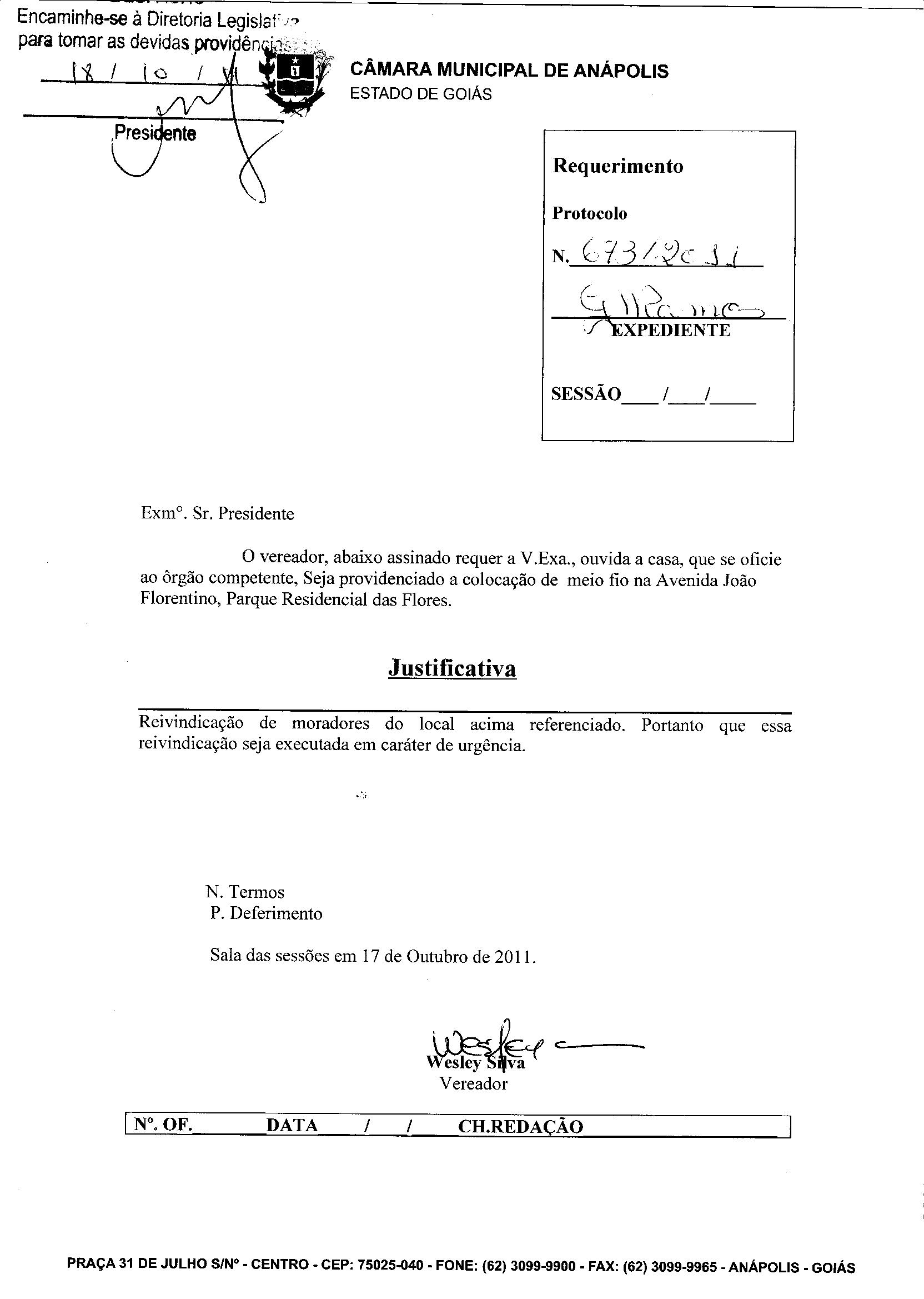 Ementa: O VEREADOR, ABAIXO ASSINADO REQUER A V.EXA,. OUVIDA A CASA, QUE SE OFICIE AO ÓRGÃO COMPETENTE, SEJA PROVIDENCIADO A COLOCAÇÃO DE MEIO FIO NA AVENIDA JOÃO FLORENTINO, PARQUE RESIDENCIAL DAS FLORES.