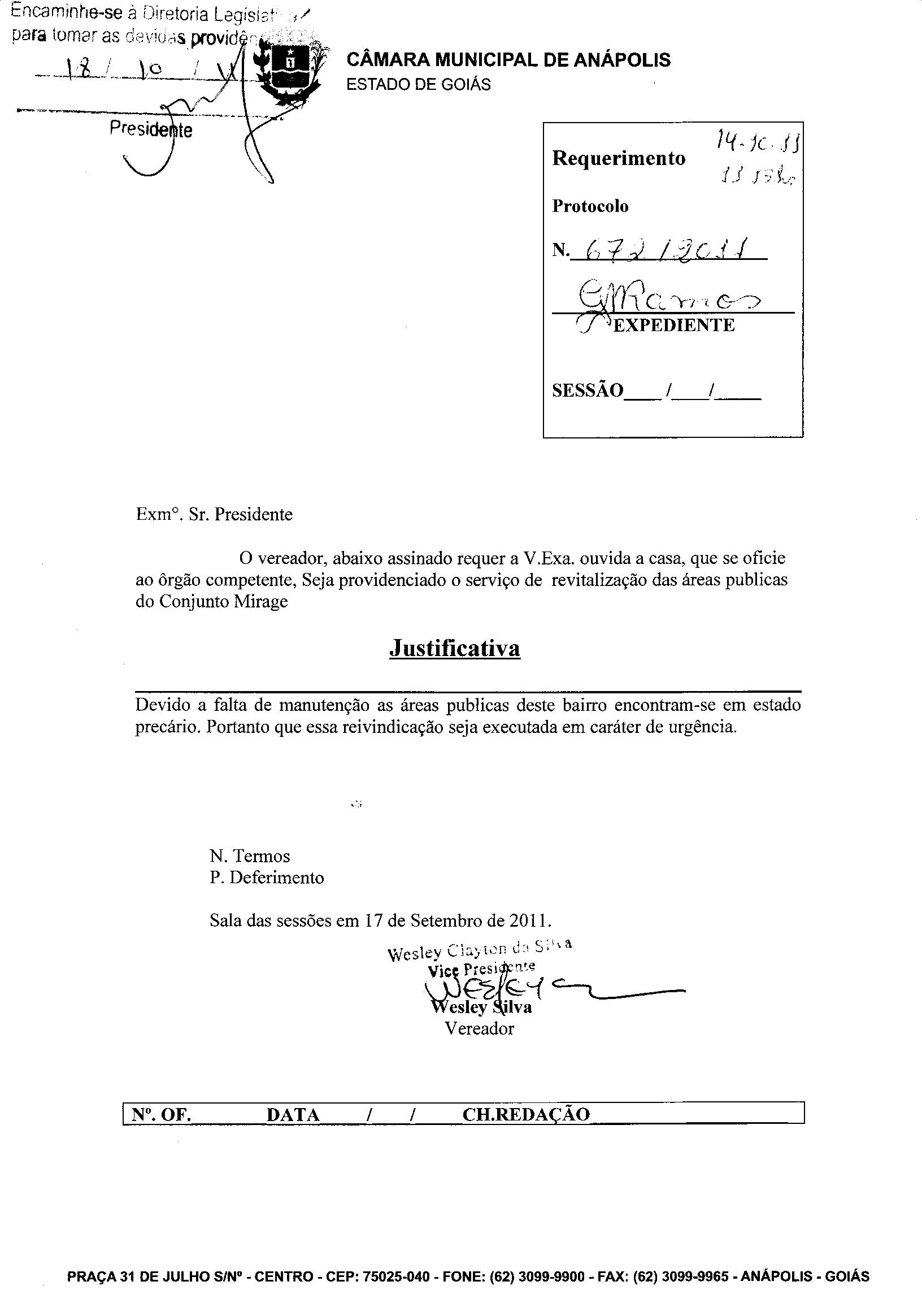 Ementa: O VEREADOR ABAIXO ASSINADO REQUER A V.EXA. OUVIDA A CASA, QUE SE OFICIE AO ÓRGÃO COMPETENTE, SEJA PROVIDENCIADO O SERVIÇO DE REVITALIZAÇÃO DAS ÁREAS PUBLICAS DO CONJUNTO MIRAGE.