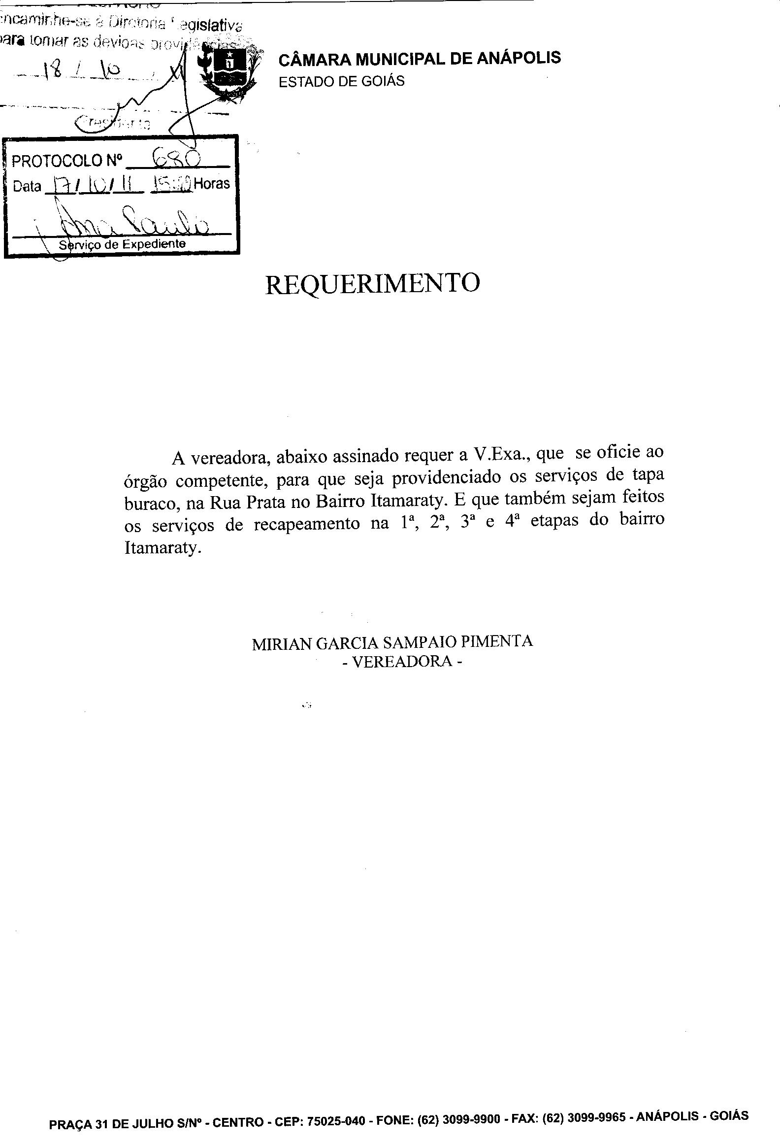 Ementa: A VEREADORA, ABAIXO ASSINADO REQUER A V.EXA., QUE SE OFICIE AO ÓRGÃO COMPETENTE, PARA QUE SEJA PROVIDENCIADO OS SERVIÇOS DE TAPA BURACOS, NA RUA PRATA NO BAIRRO ITAMARATY. E QUE TAMBÉM SEJAM FEITOS OS SERVIÇOS DE RECAPEAMENTO NA 1ª , 2ª, 3ª E 4ª ETAPA DO BAIRRO ITAMARATY.
