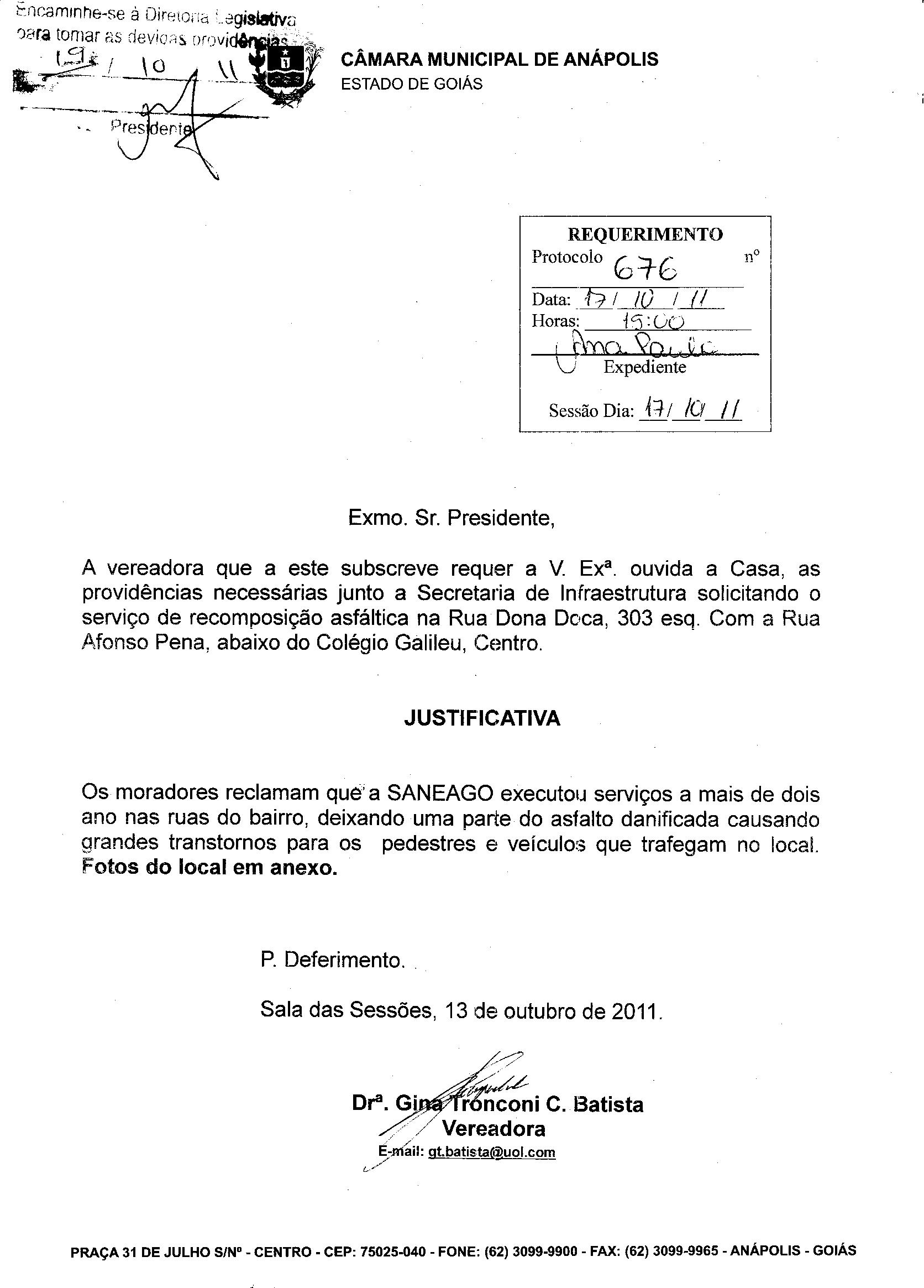 Ementa: A VEREADORA QUE A ESTE SUBSCREVE REQUER A V.EXª. OUVIDA A CASA, AS PROVIDÊNCIAS NECESSÁRIAS JUNTO A SECRETARIA MUNICIPAL DE INFRAESTRUTURA SOLICITANDO O SERVIÇO DE RECOMPOSIÇÃO ASFÁLTICA NA RUA DOCA, 303 ESQ. COM A RUA AFONSO PENA, ABAIXO DO COLÉGIO GALILEU, CENTRO.