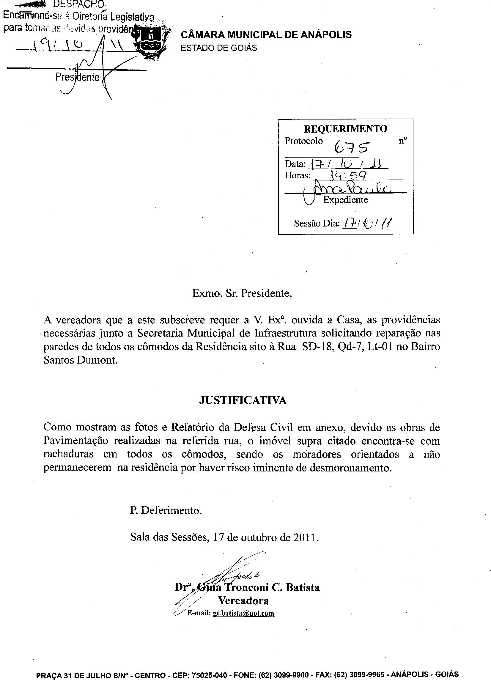 Ementa: A VEREADORA QUE A ESTE SUBSCREVE REQUER A V.EXª. OUVIDA A CASA, AS PROVIDÊNCIAS NECESSÁRIAS JUNTO A SECRETARIA MUNICIPAL DE INFRAESTRUTURA SOLICITANDO REPARAÇÃO NAS PAREDES DE TODOS OS CÔMODOS DA RESIDENCIA SITIO À RUA SD-18, QD-7, LT-01 NO BAIRRO SANTOS DUMONT.