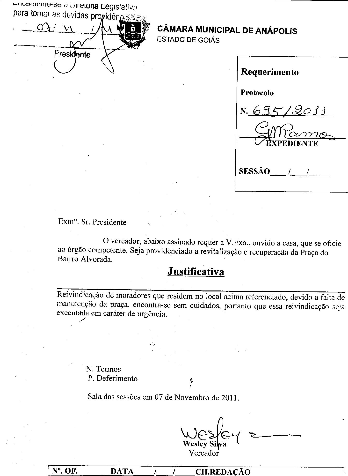 Ementa: O VERADOR ABAIXO ASSINADO REQUER A V. EXA., OUVIDA A CASA, QUE SE OFICIE AO ÓRGÃO COMPETENTE, SEJA PROVIDENCIADO REVITALIZAÇÃO DA PRAÇA DO BAIRRO ALVORADA.