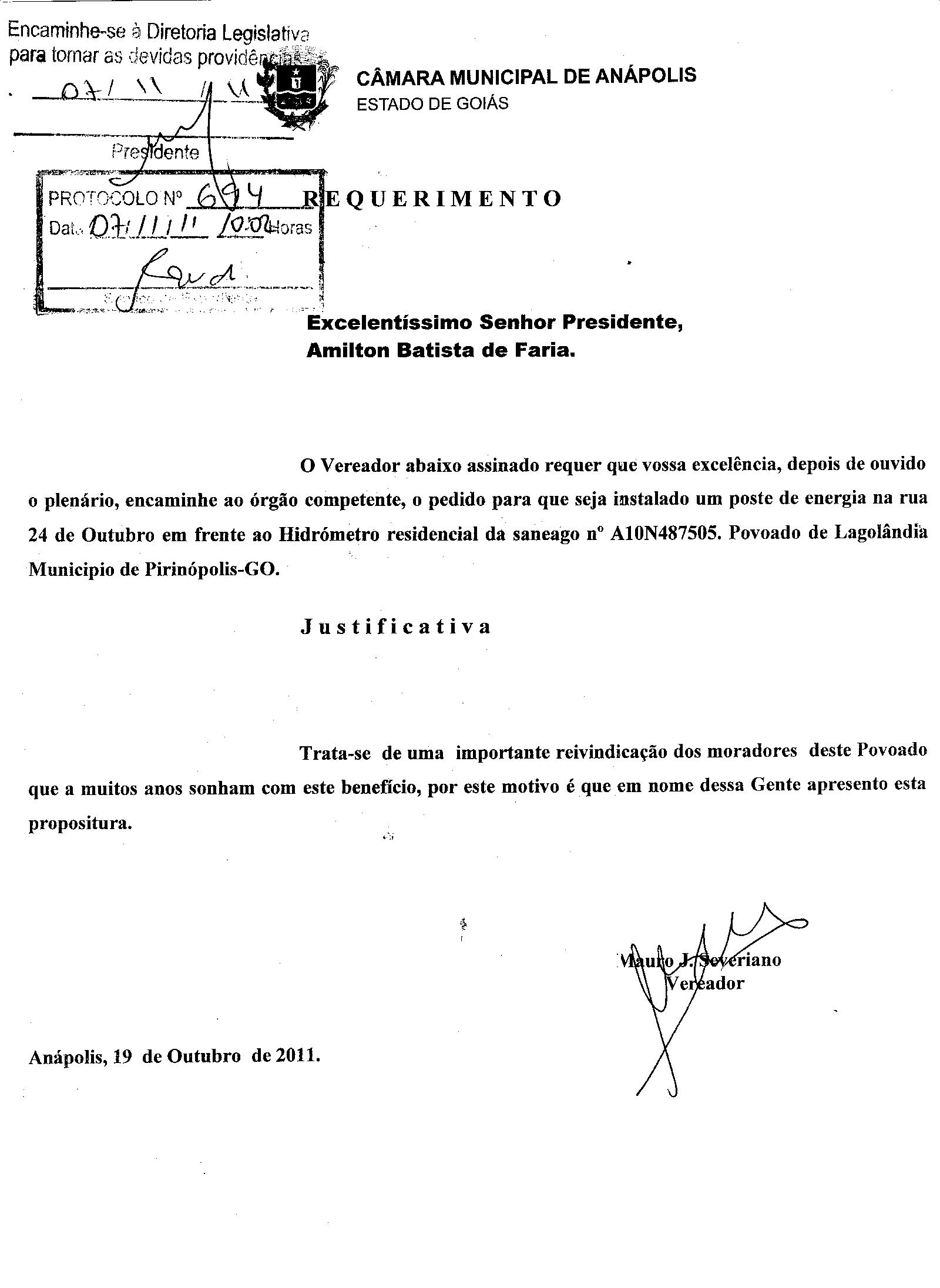 Ementa: O VEREADOR ABAIXO ASSINADO REQUER QUE VOSSA EXCELÊNCIA, DEPOIS DE OUVIDO O PLENÁRIO, ENCAMINHE AO ÓRGÃO COMPETENTE, O PEDIDO PARA QUE SEJAINSTALADO UM POSTE DE ENERGIA NA RUA 24 DE OUTUBRO EM FRENTE AO HIDRÓMETRO RESIDENCIAL DA SANEAGO N° A10N487505. POVOADO DE LAGOLÂNDIA MUNICIPIO DE PIRINÓPOLIS-GO