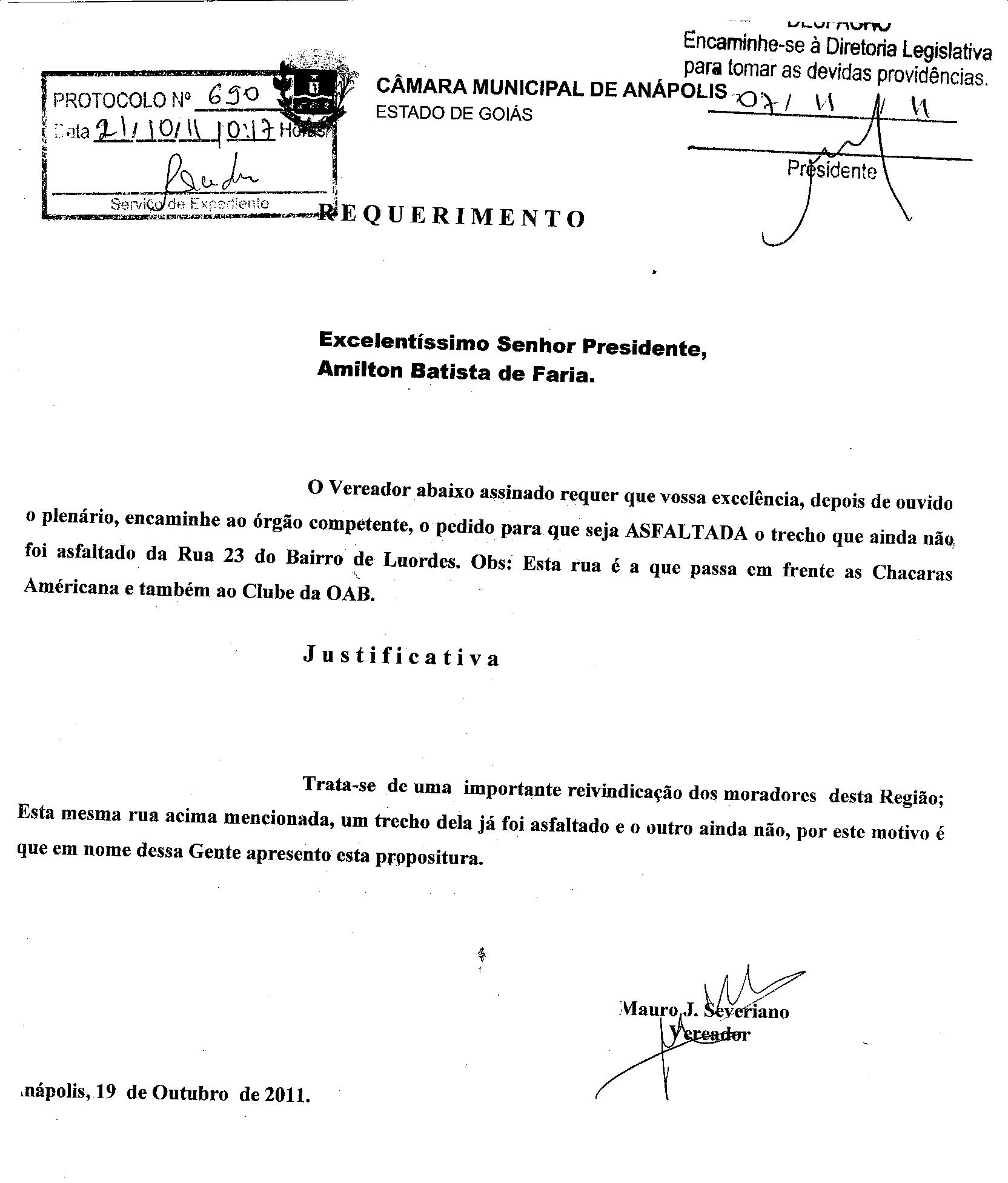 Ementa: O VEREADOR ABAIXO ASSINADO REQUER QUE VOSSA EXCELÊNCIA, DEPOIS DE OUVIDO O PLENÁRIO, ENCAMINHE AO ÓRGÃO COMPETENTE, O PEDIDO PARA QUE SEJA ASFALTADA O TRECHO QUE AINDA NÃO FOI ASFALTADO DA RUA 23 DO BAIRRO DE LOURDES. OBS: ESTA RUA É A QUE PASSA EM FRENTE AS CHACARAS AMÉRICANA E TAMBEM AO CLUB DA OAB.