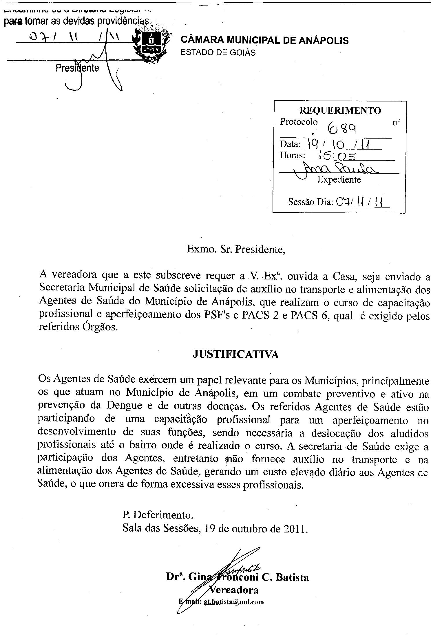 Ementa: A VEREADORA QUE A ESTE SUBSCREVE REUQER A V.EXª. OUVIDA A CASA, SEJA ENVIADO A SECRETARIA MUNICIPAL DE SAÚDE SOLICITAÇÃO DE AUXÍLIO TRANSPORTE E ALIMENTAÇÃO DOS AGENTES DE SAÚDE DO MUNICÍPIO DE ANÁPOLIS, QUE REALIZAM O CURSO DE CAPACITAÇÃO PROFISSIONAL E APERFEIÇOAMENTO DOS PSF'S E PACS 2 E PACS 6, QUAL É EXIGIDO PELOS REFERIDOS ÓRGÃOS.